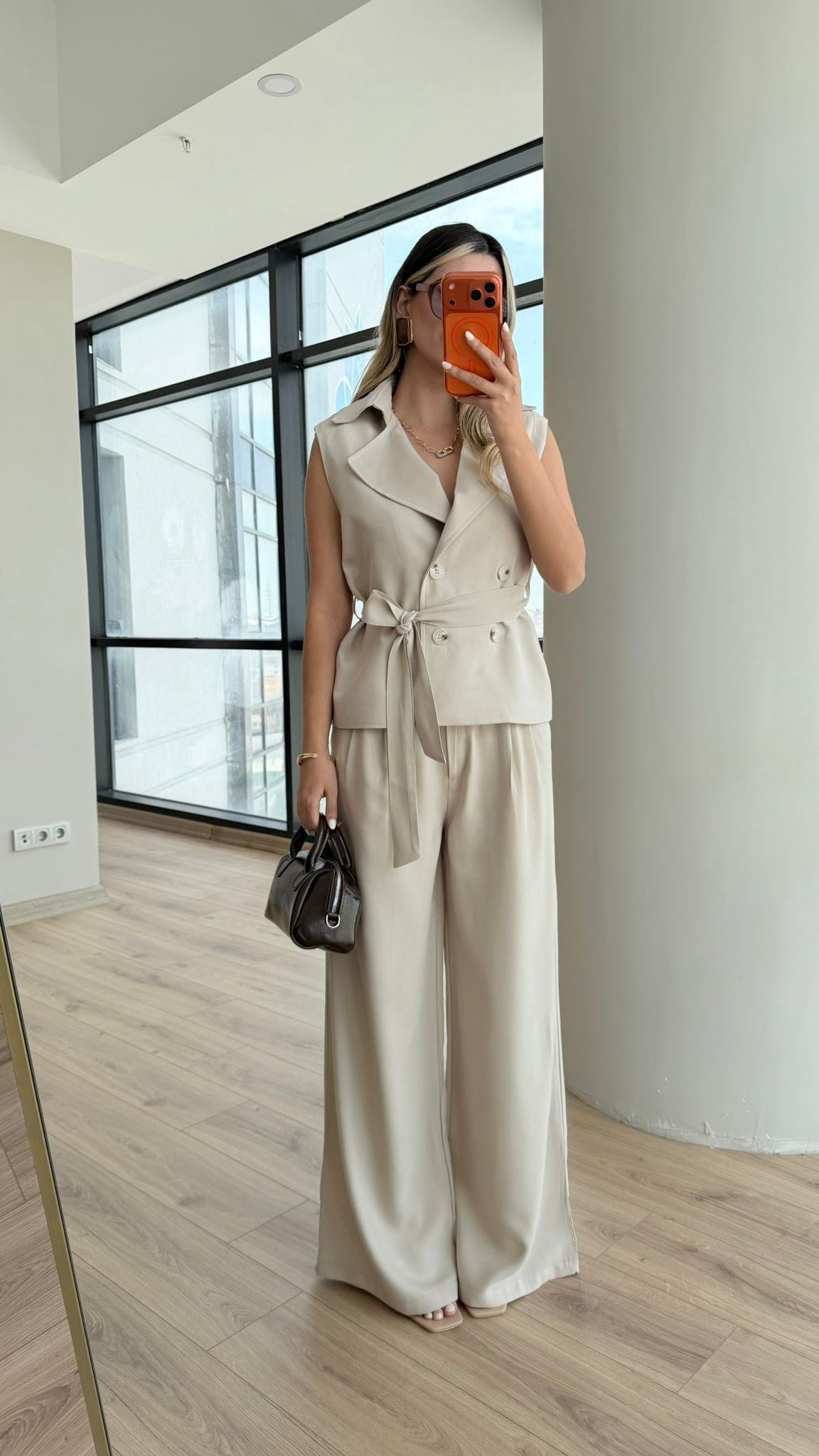 Kruvaze yelek formu ve belden bağlamalı kemer detayı sayesinde vücut formunu ön plana çıkarırken, dökümlü bol paça pantolon kesimi gün boyu konfor sağlar.