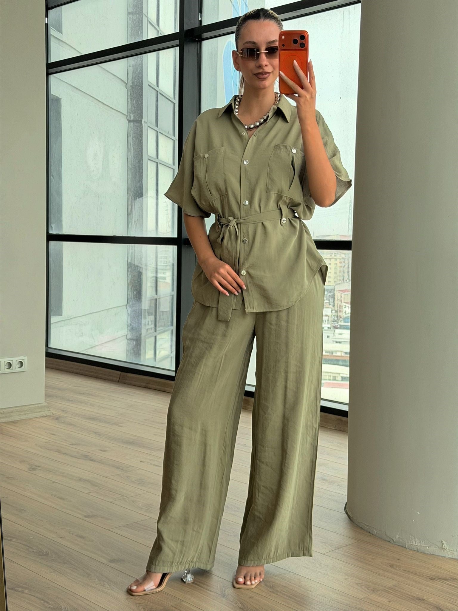 Bağlama Detaylı Gömlek Pantolon Takım Yeşil