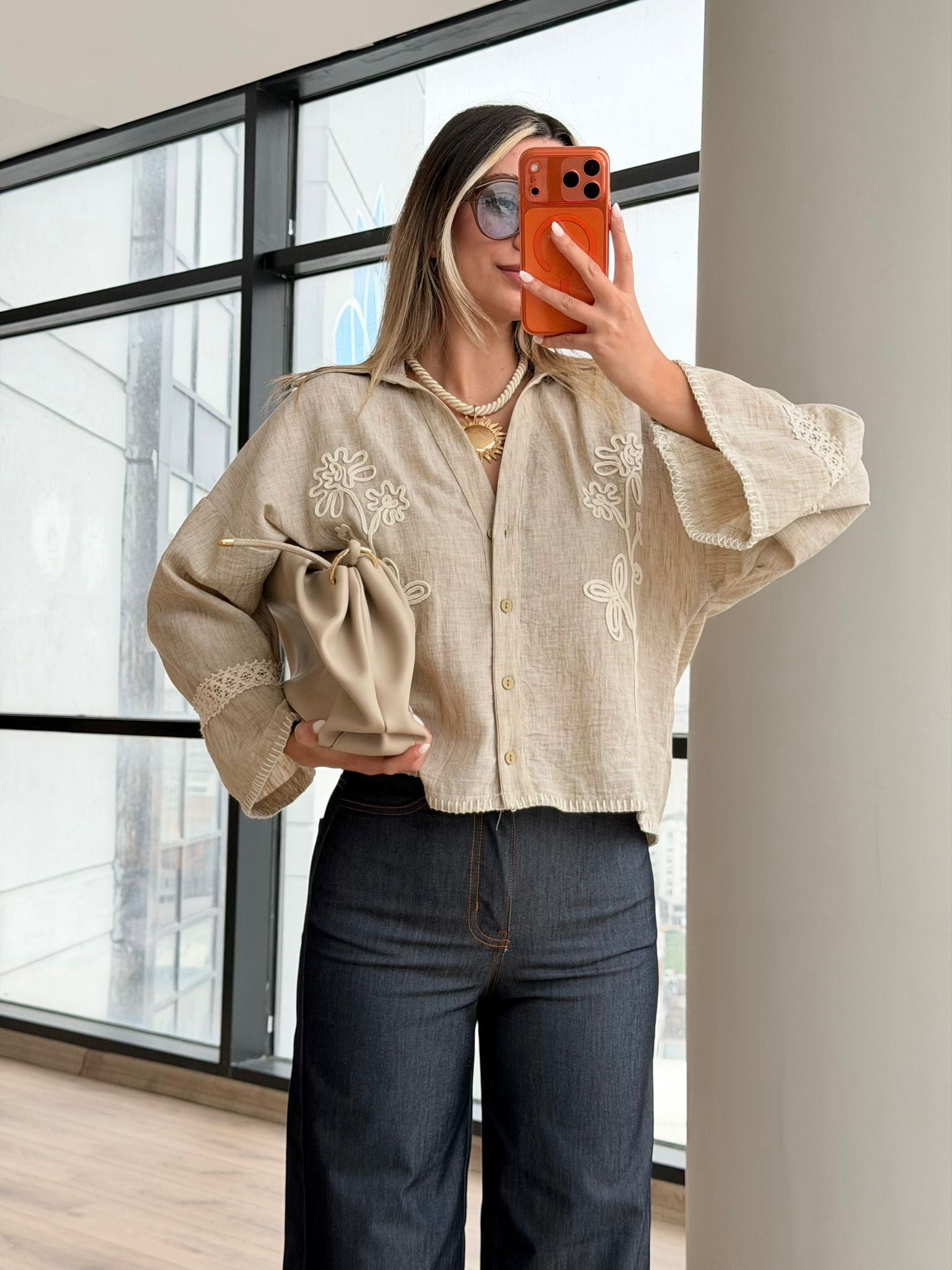 Beyaz Nakış İşlemeli Vizon Gömlek