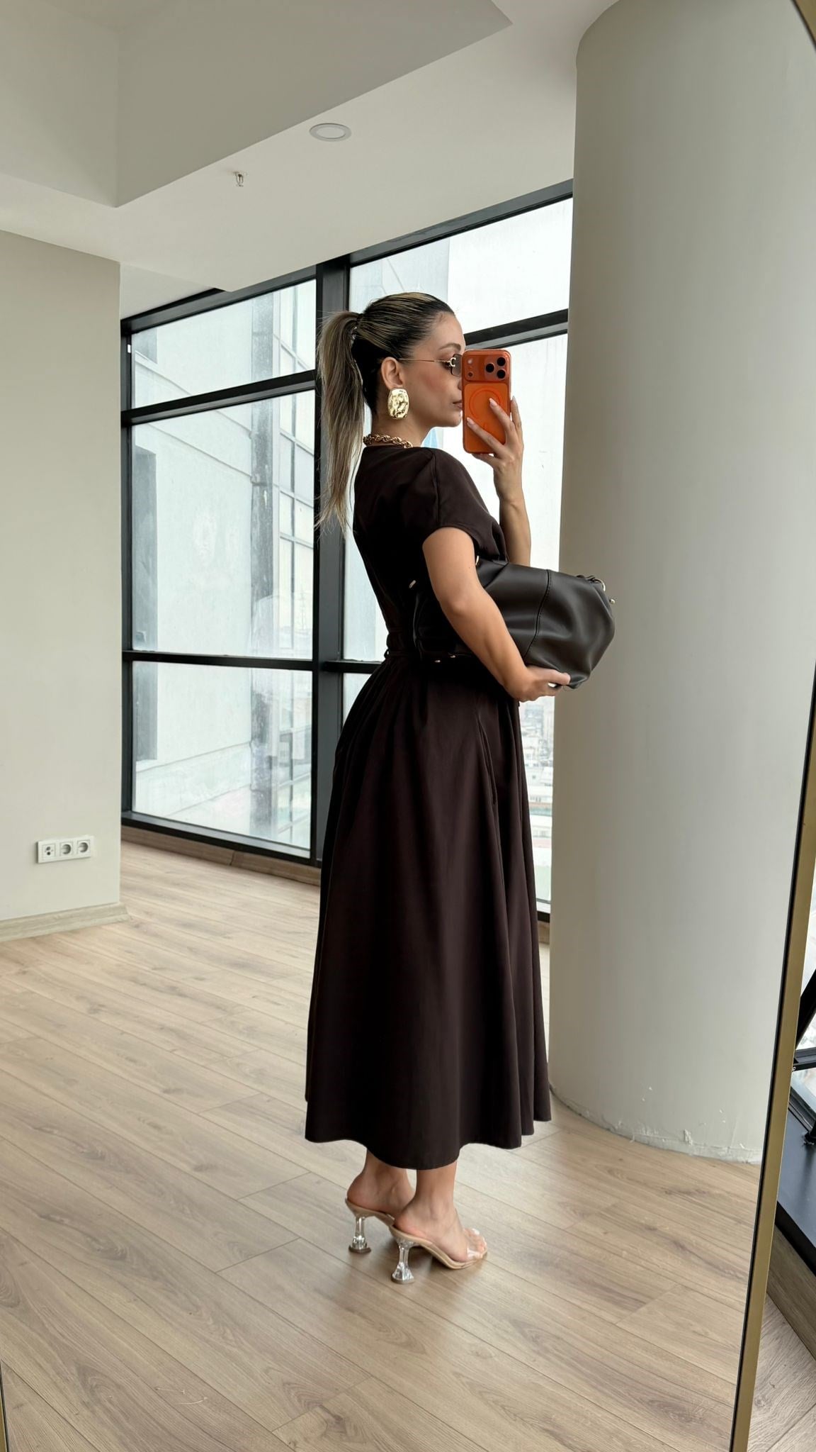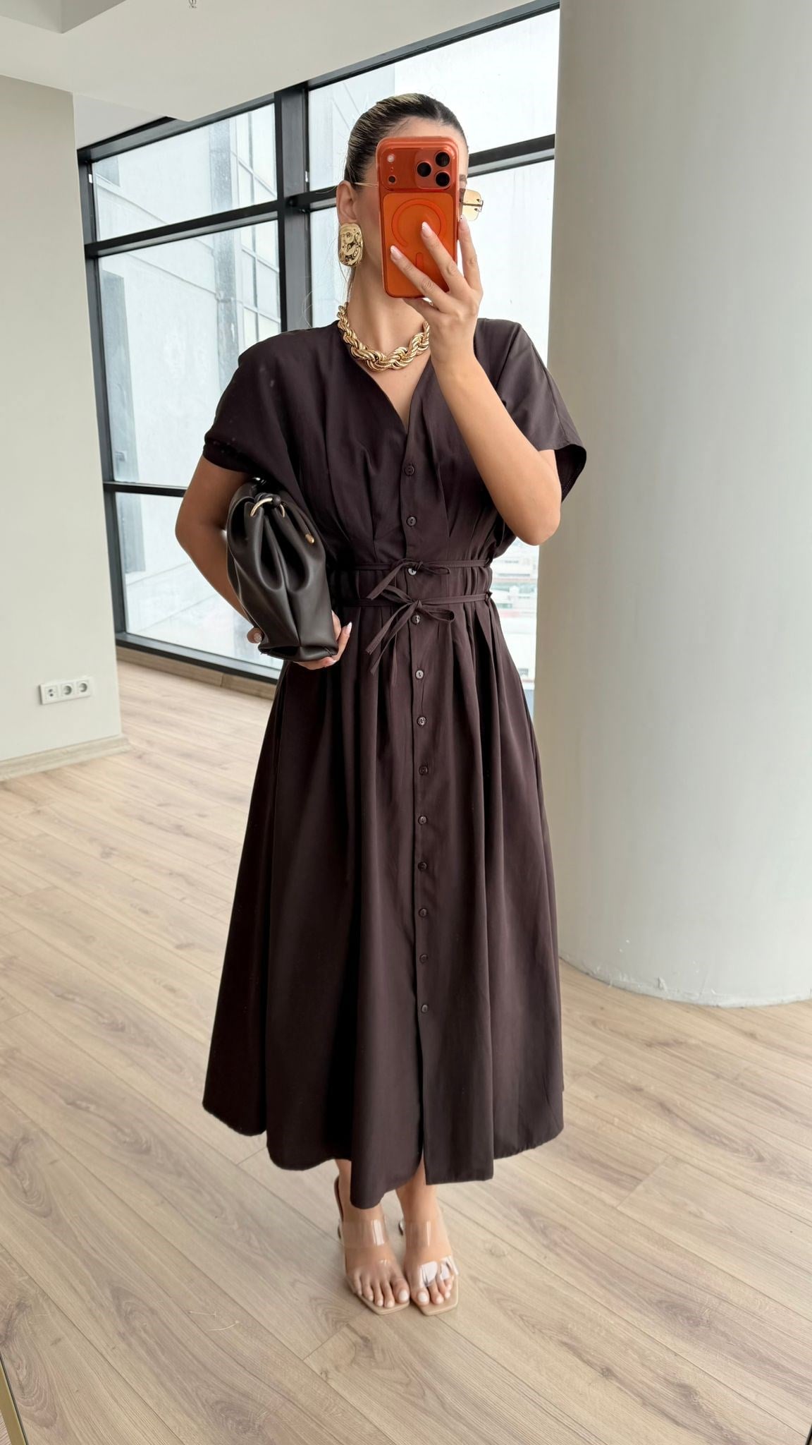 Boydan Boya Düğmeli İnce Kuşak İpli Elbise Kahverengi