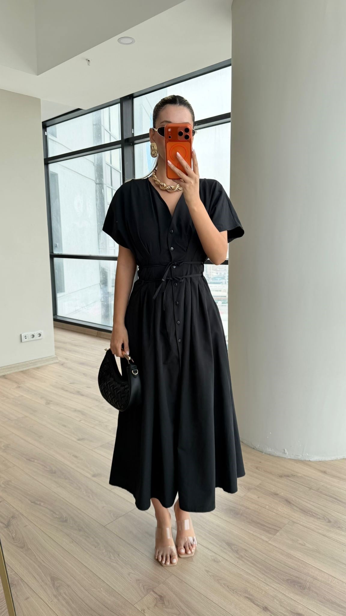 Boydan Boya Düğmeli İnce Kuşak İpli Elbise Siyah