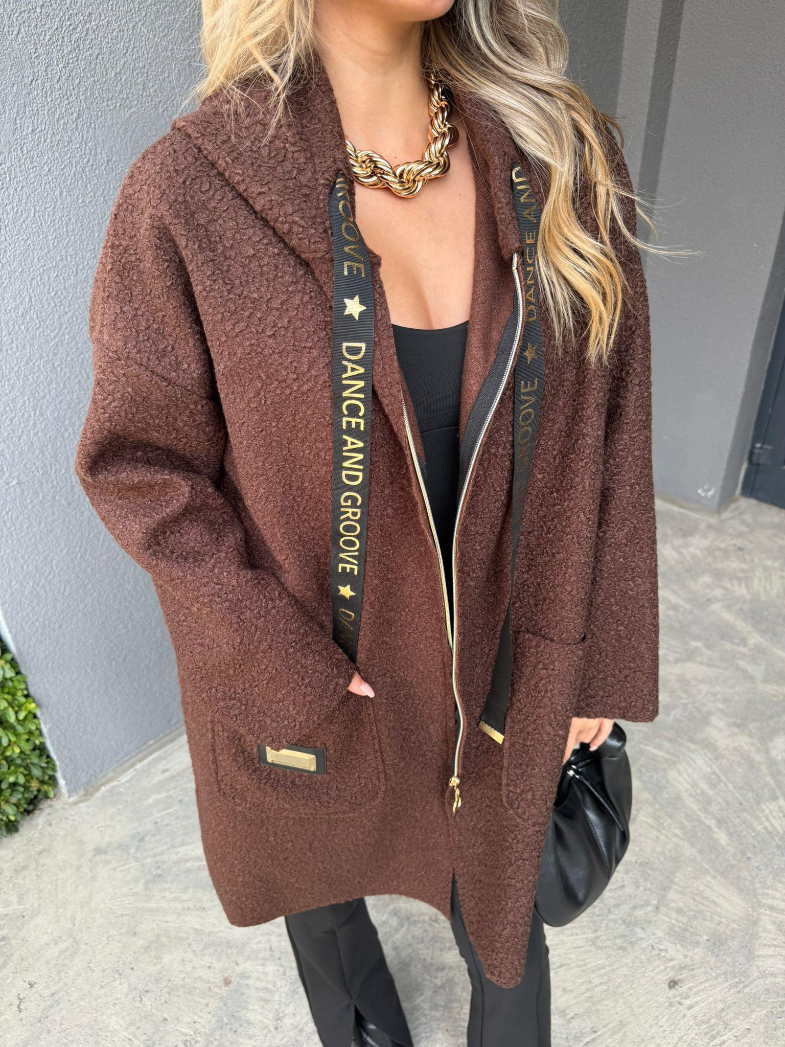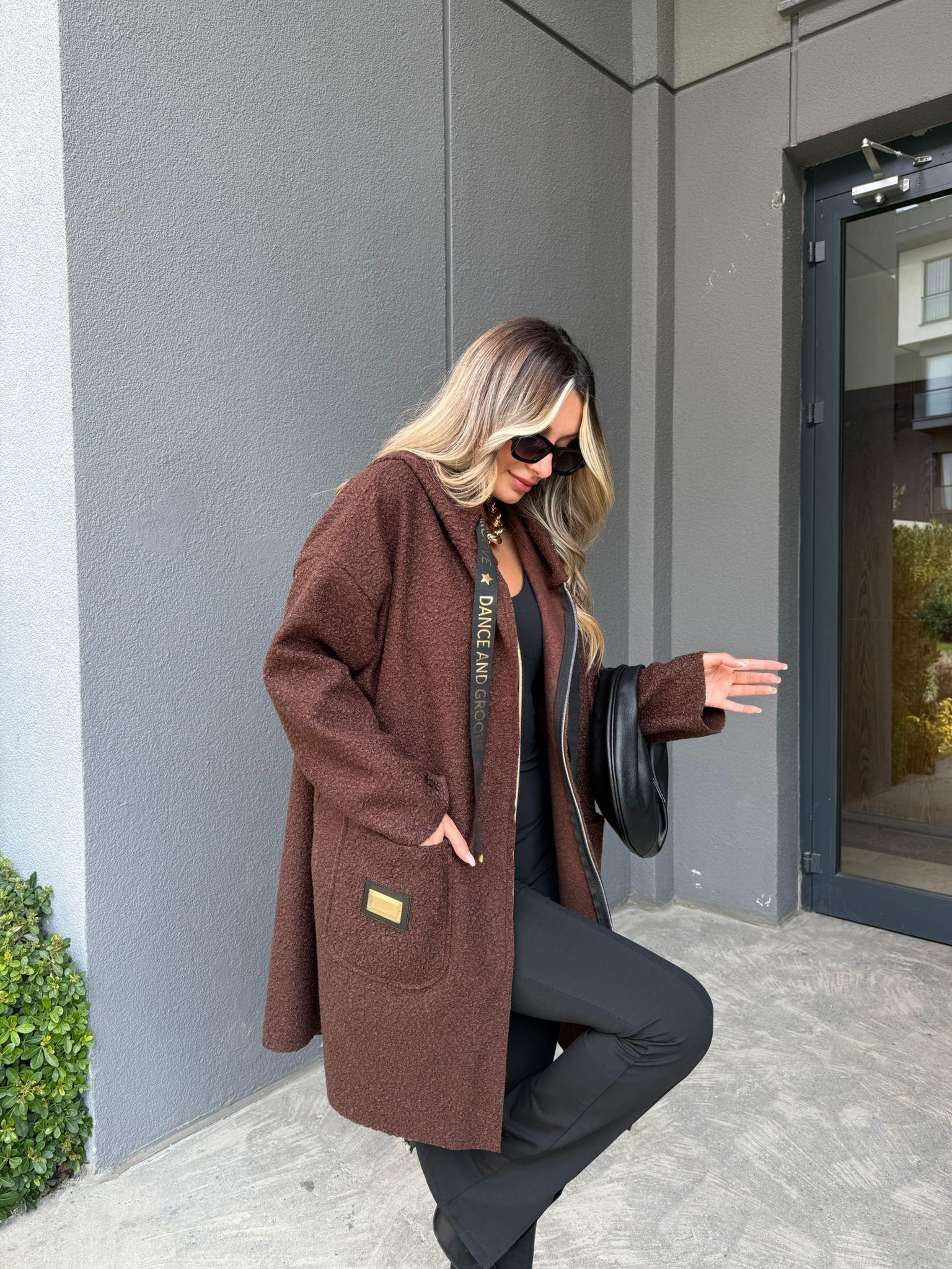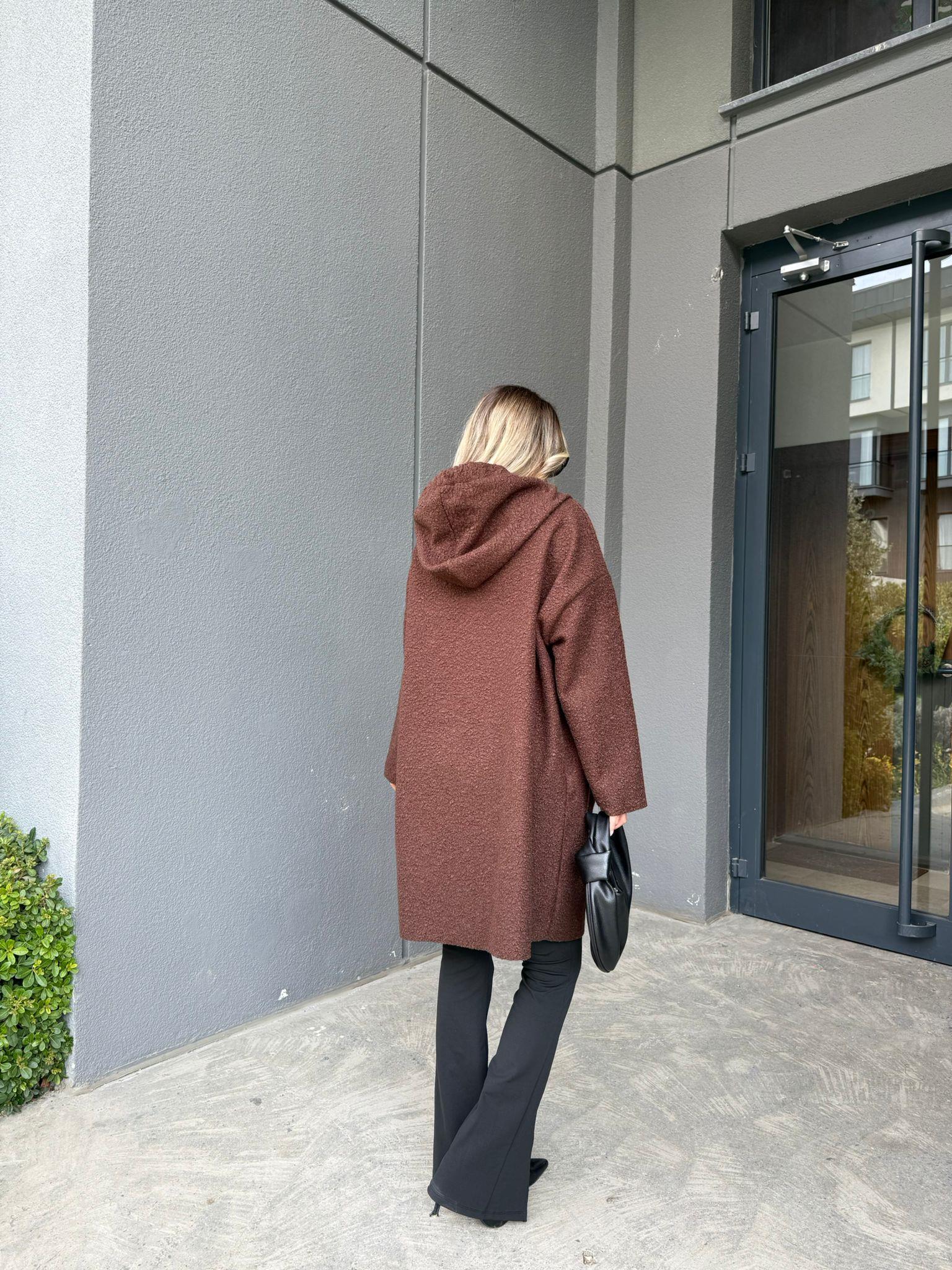 Buklet Kapüşonlu Uzun Hırka Kahve