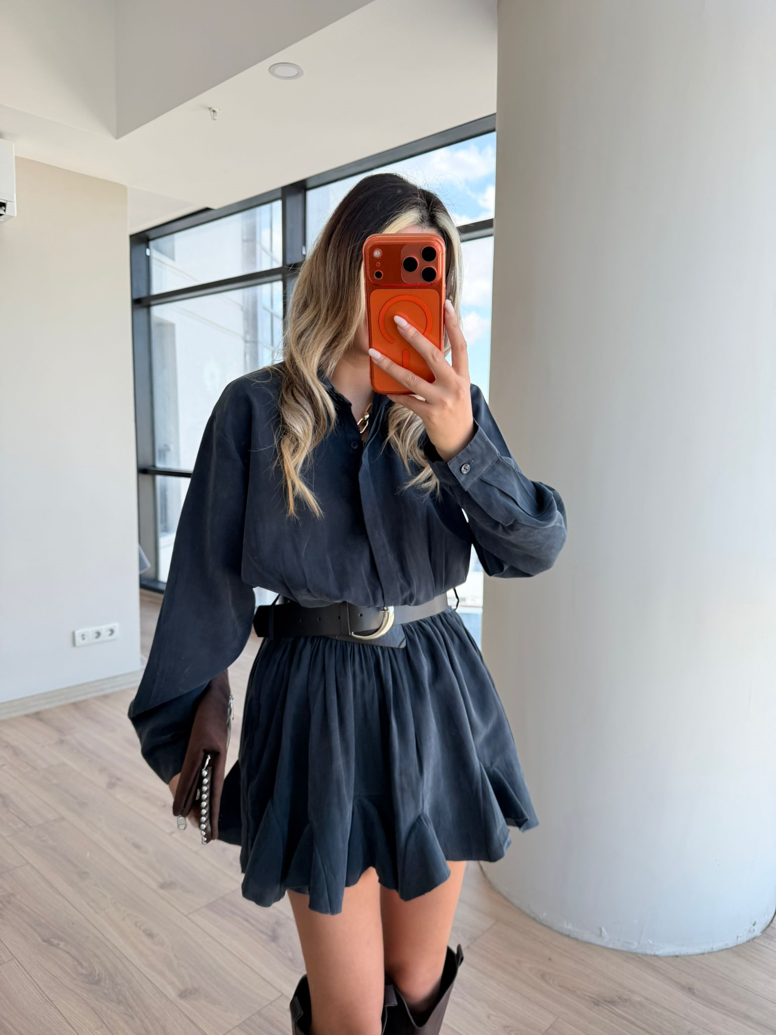 Carolina Tensel Kumaş Kemerli Etek Hareketli Elbise Antrasit