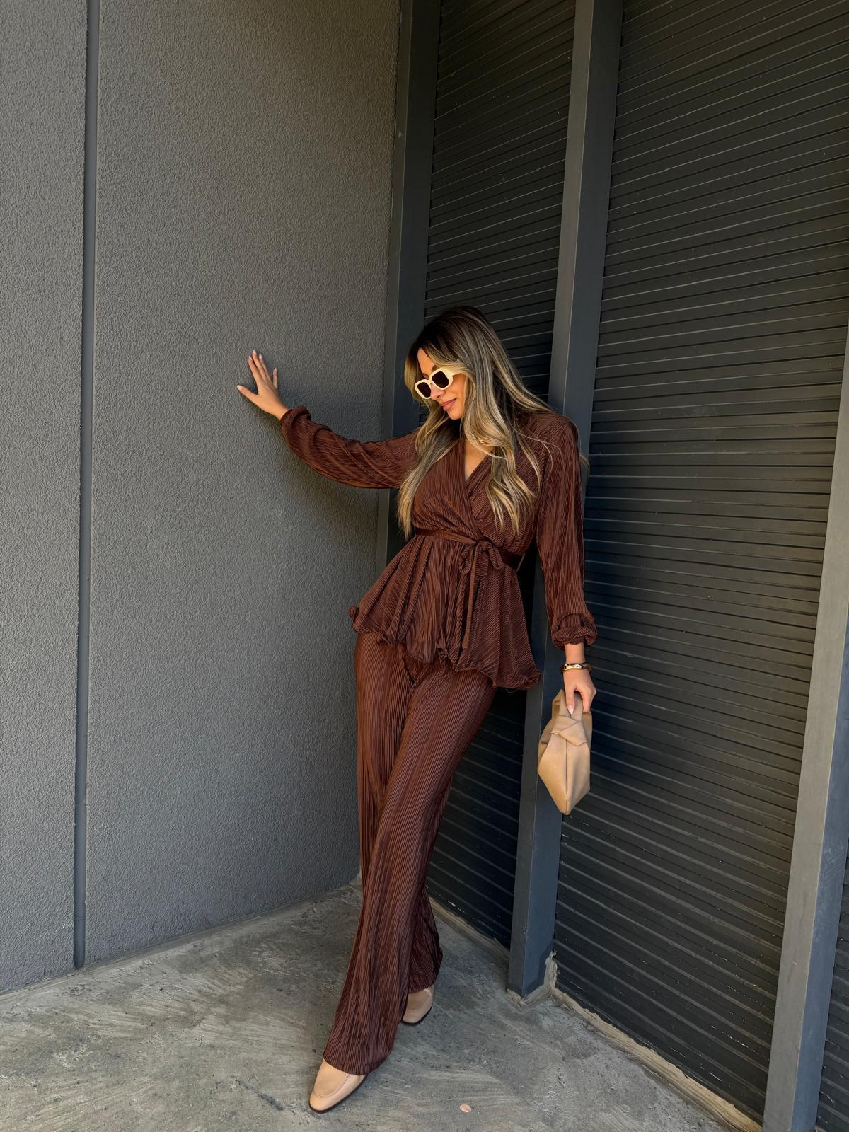 Çilek Kumaş Kruvaze Bluz Pantolon Takım Kahverengi (tkm2209V10)