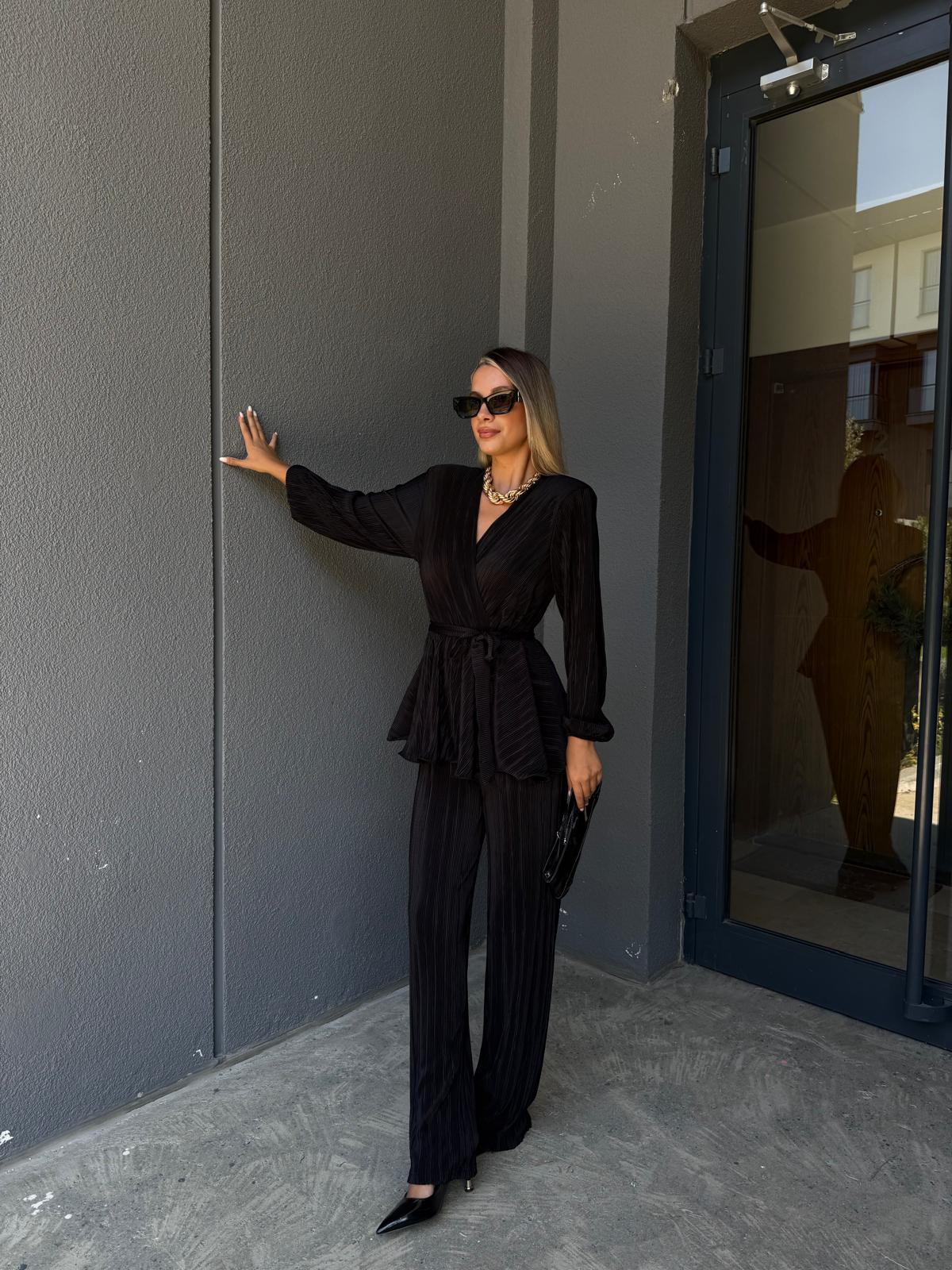 Çilek Kumaş Kruvaze Bluz Pantolon Takım Siyah (tkm2209V10)