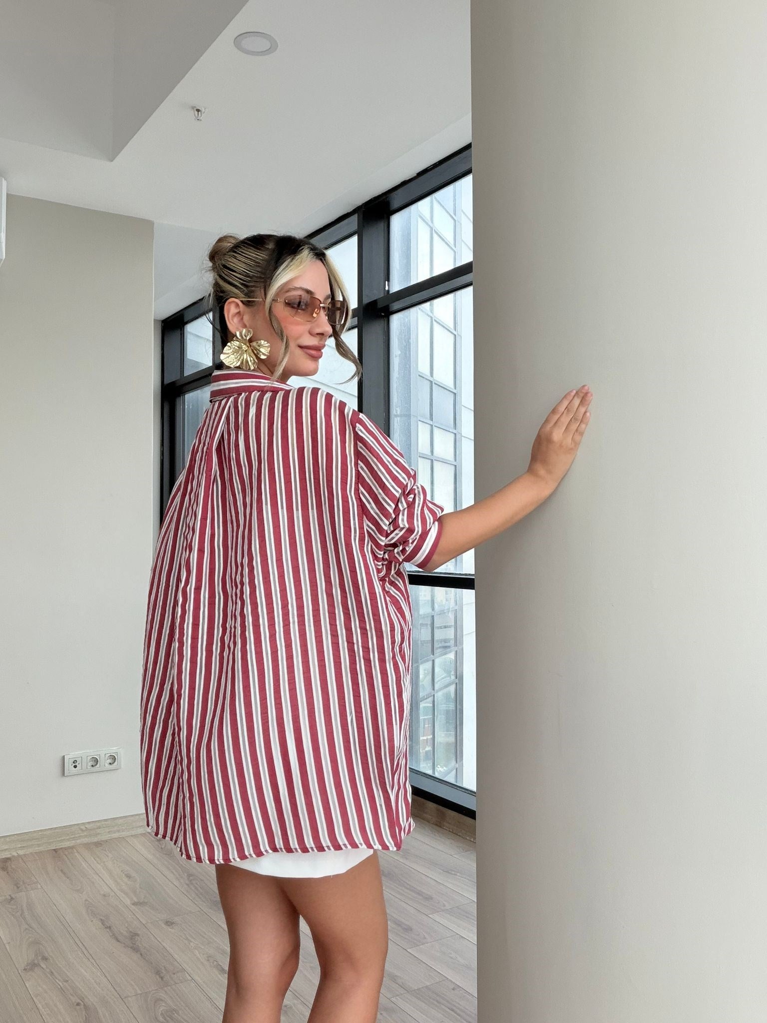 Çizgili Oversize Gömlek Bordo