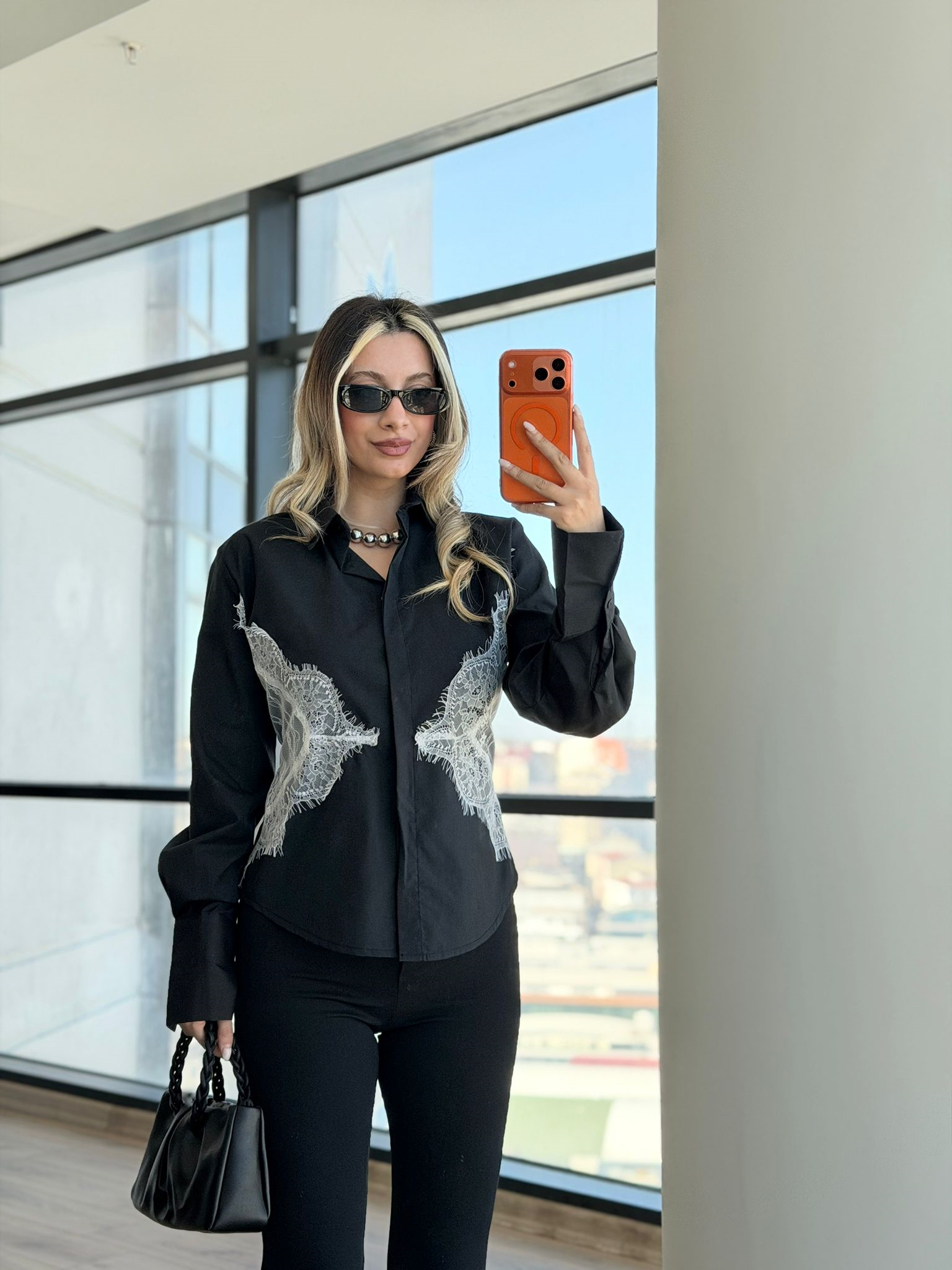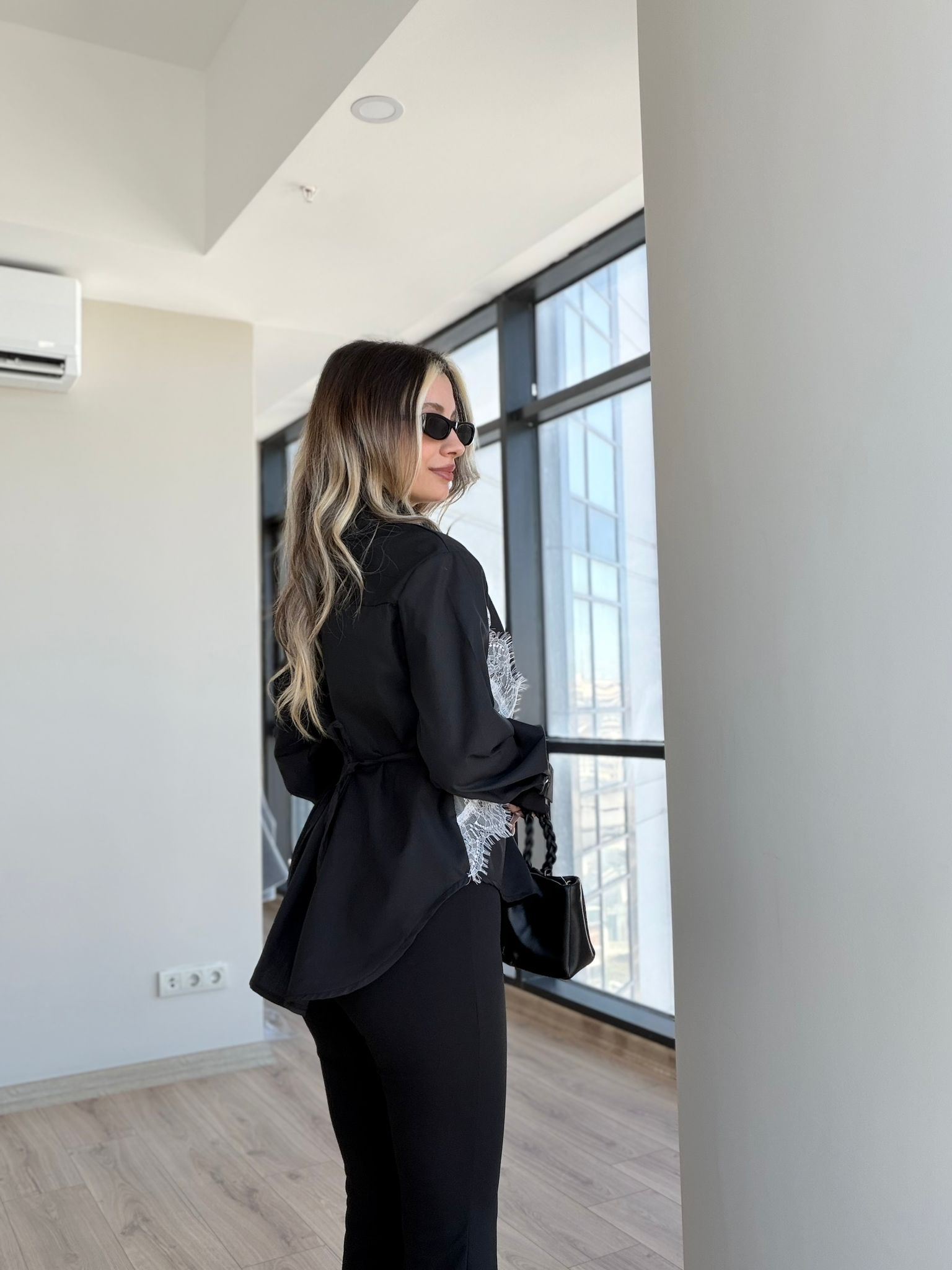 Feminen dantel dokunuşu ve arkası bağcıklı tasarımıyla öne çıkan beyaz gömlek, şık kombinlerin vazgeçilmez tamamlayıcısı.