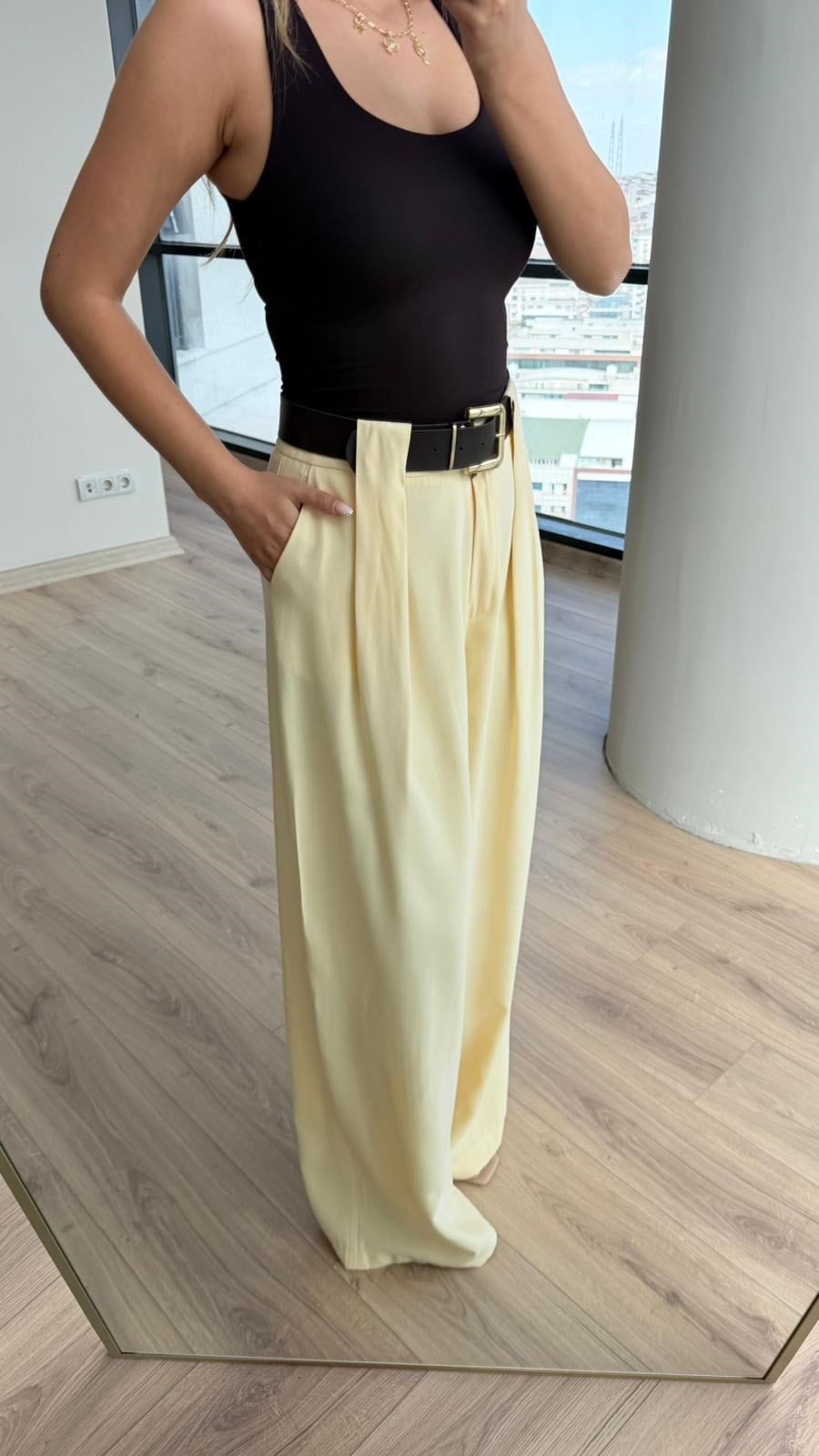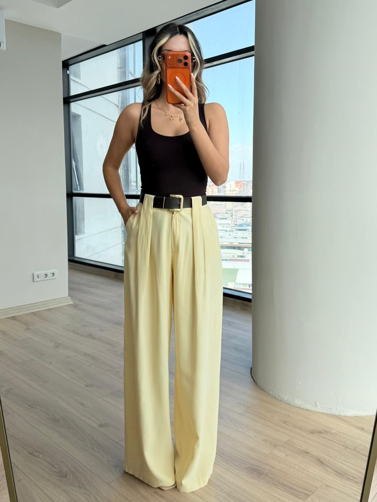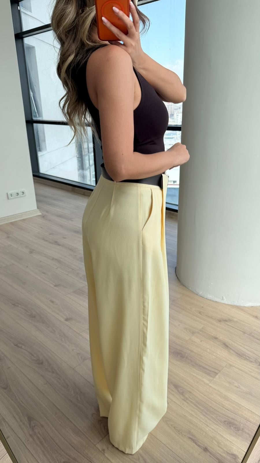 Dona Bel Pilili Sarı Kemerli Palazzo Pantolon (pnt4312dk)