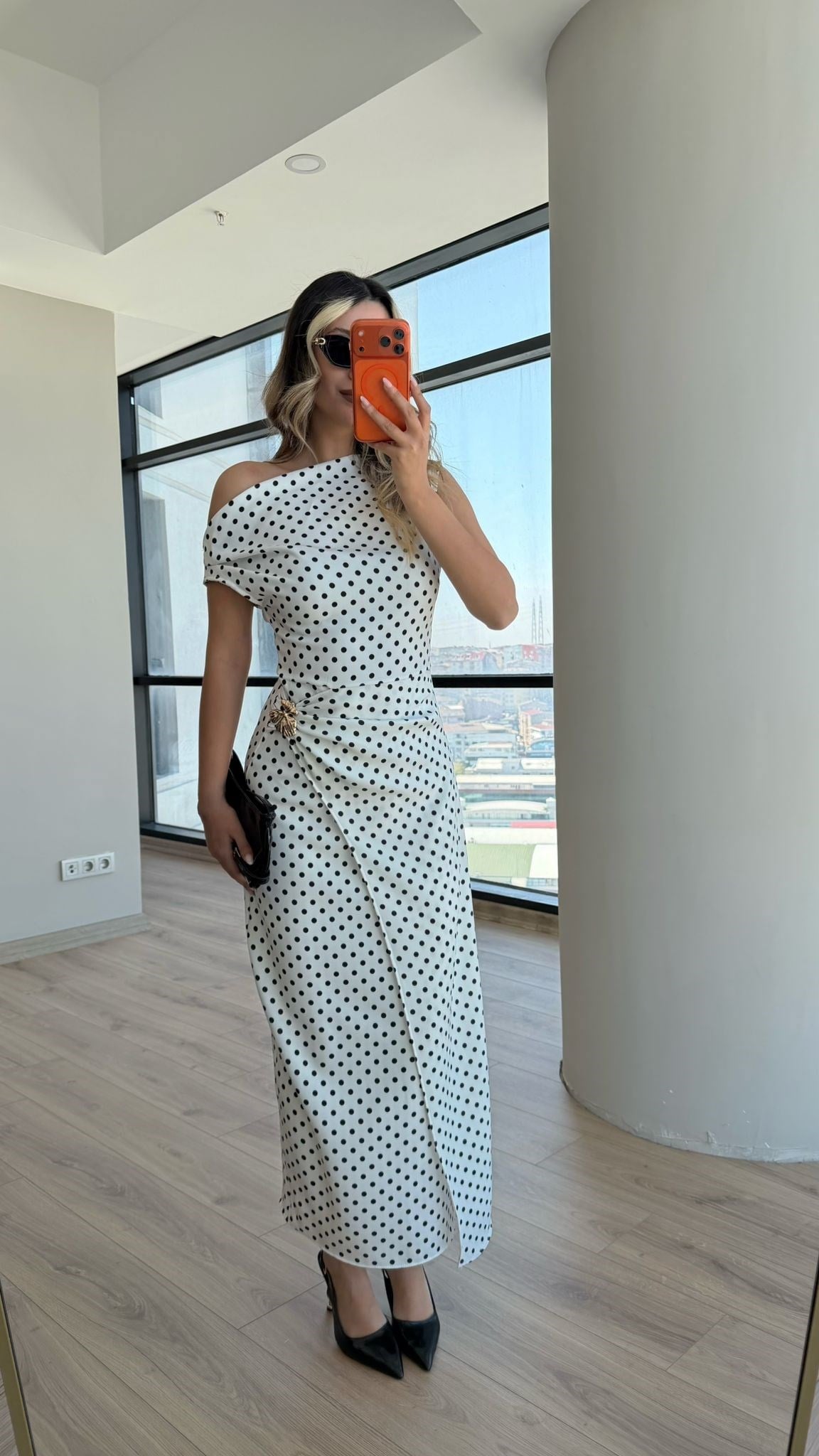 Düşük Kol Gold Aksesuarlı Puantiyeli Krep Elbise Beyaz