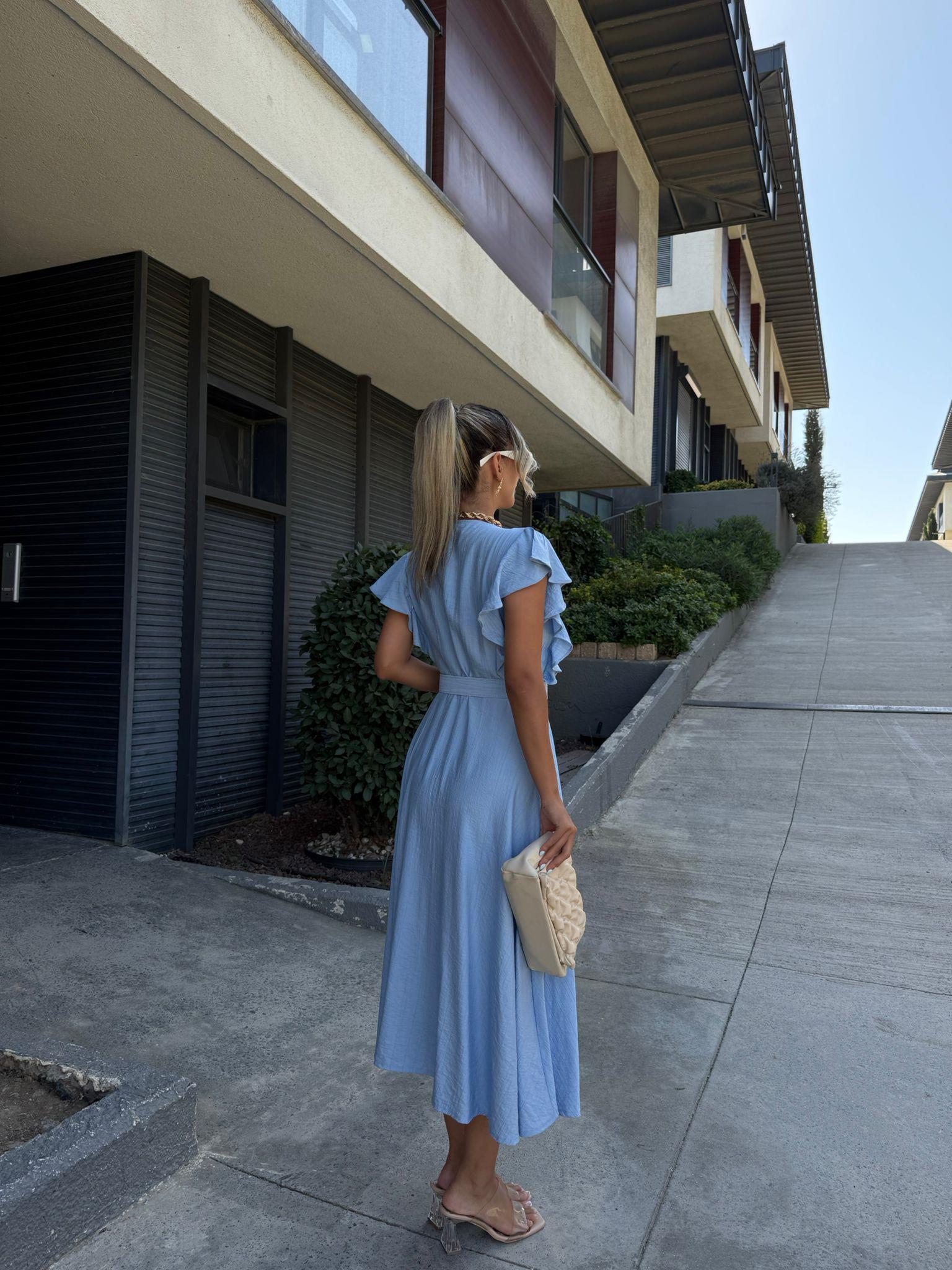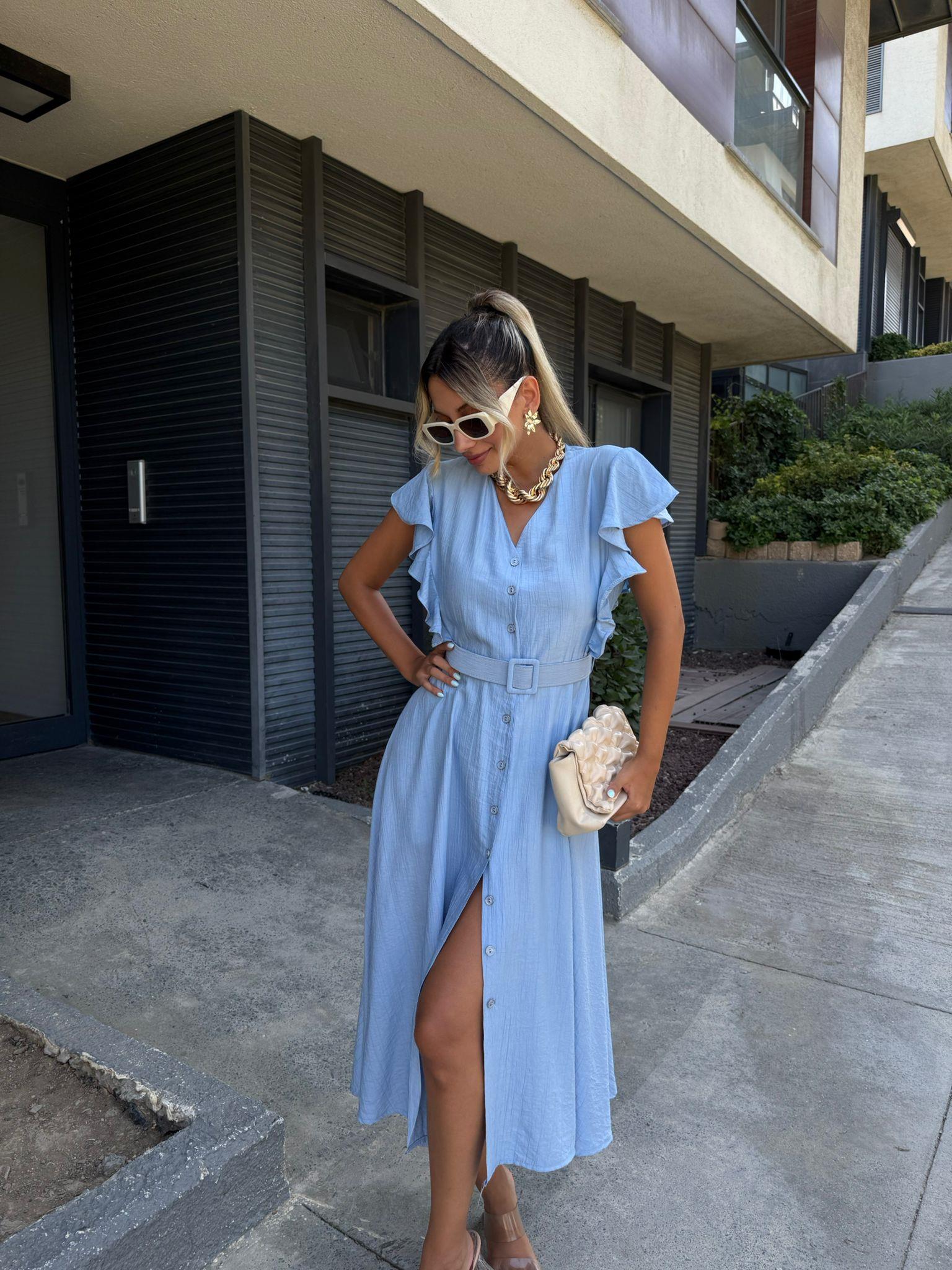 Fırfır Kol Kemerli V Yaka Gömlek Elbise Açık Mavi