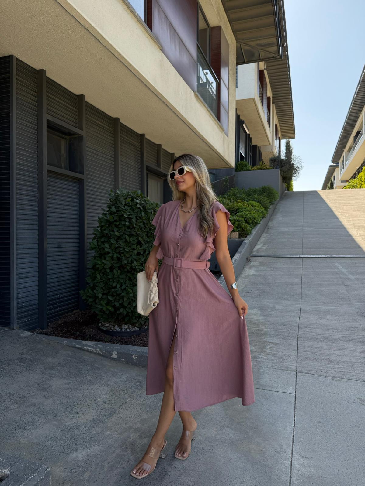 Fırfır Kol Kemerli V Yaka Gömlek Elbise Gül Kurusu