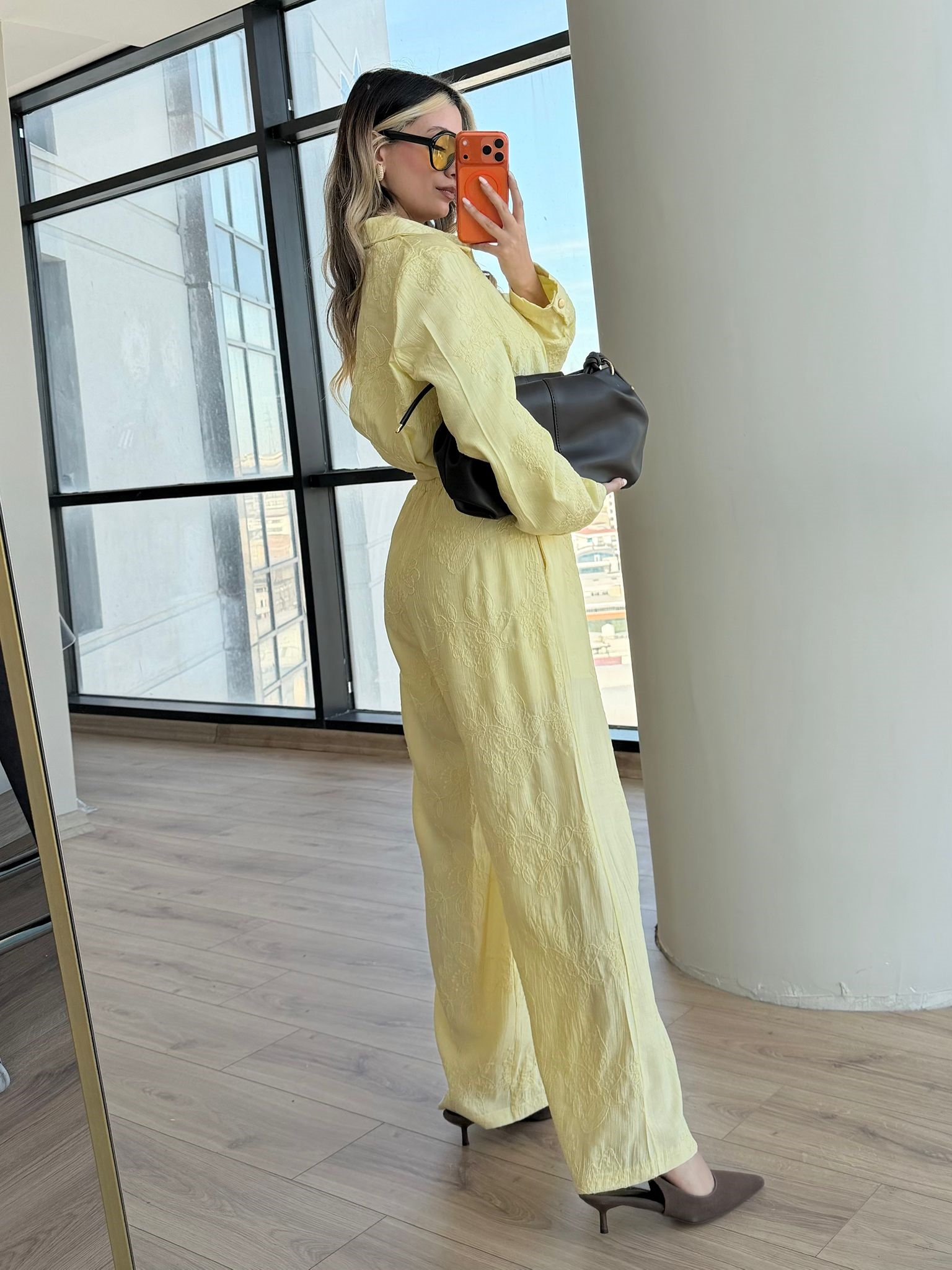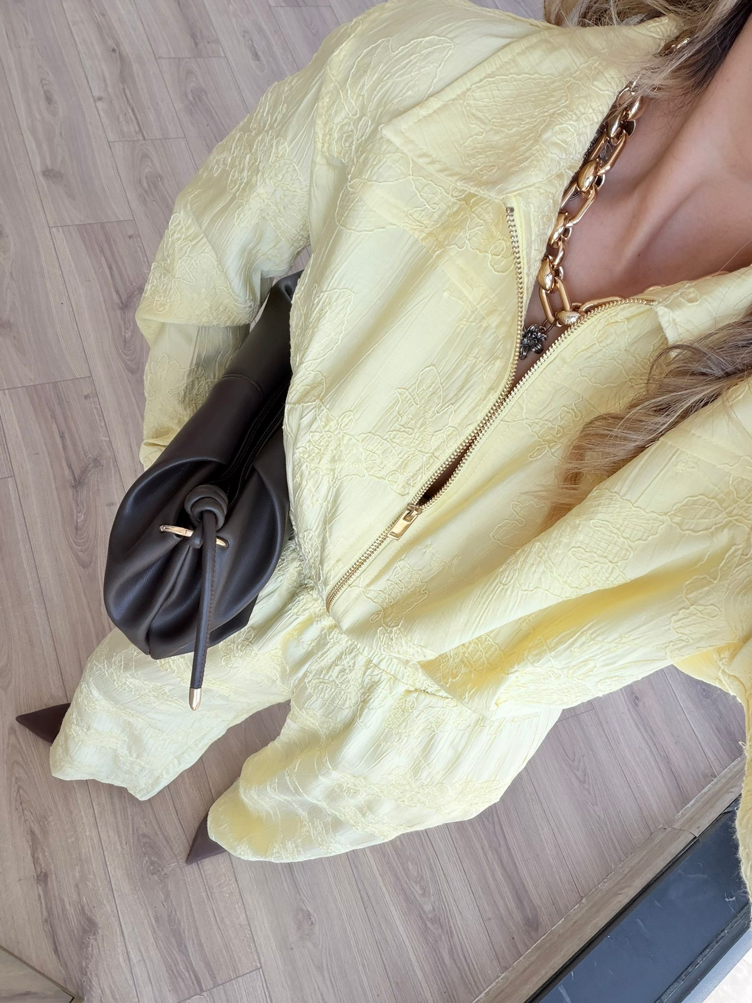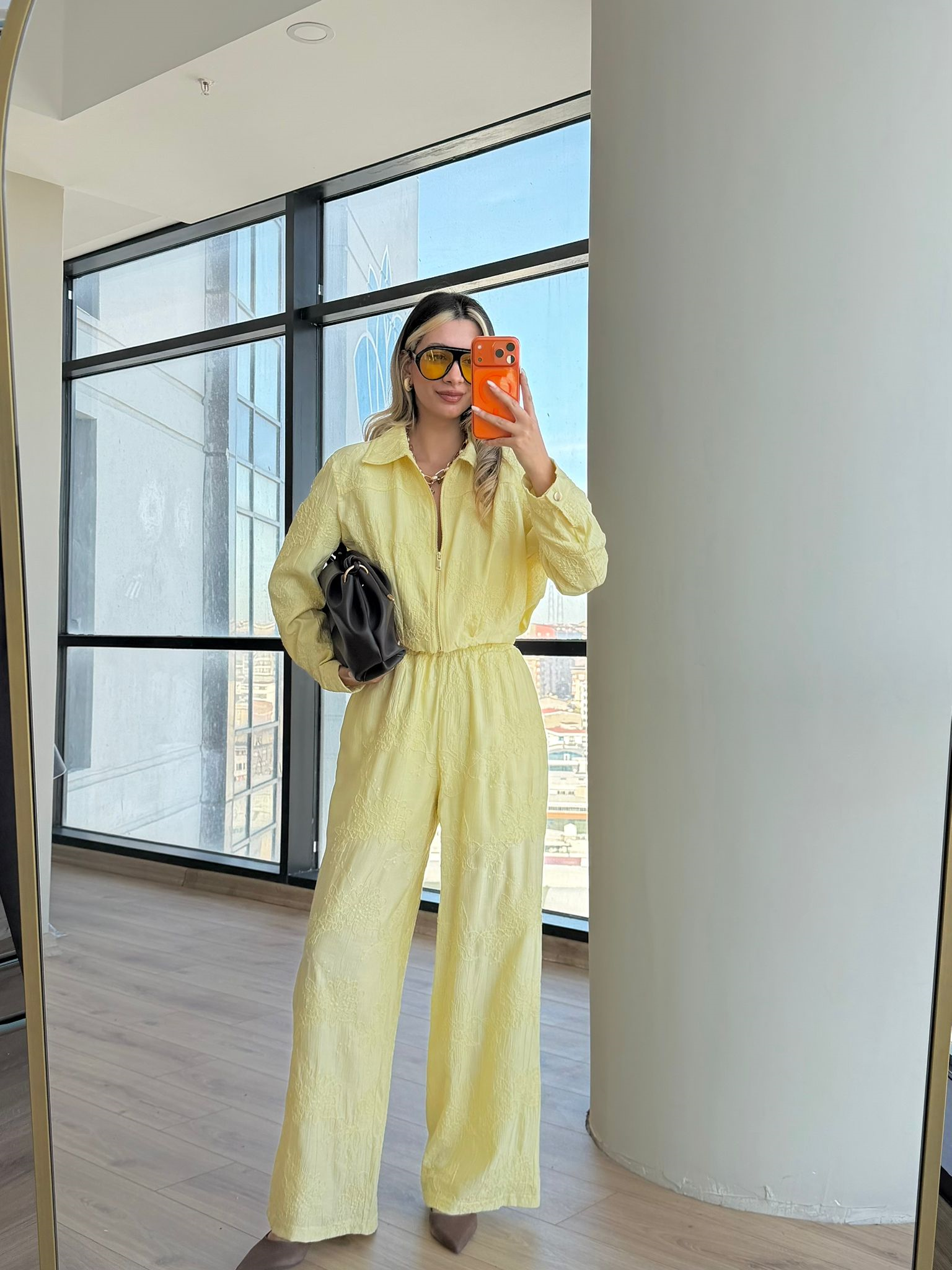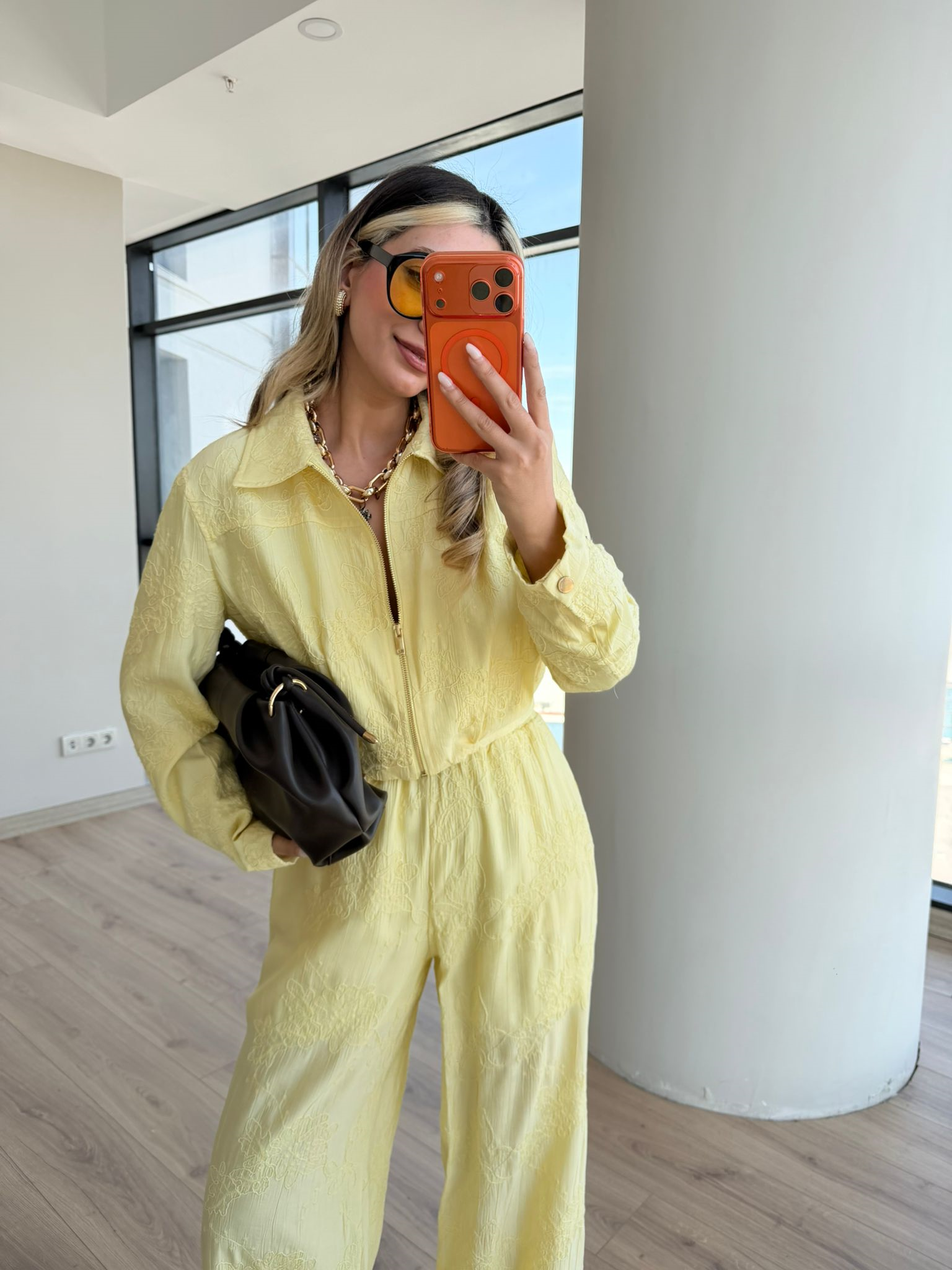 Gira Dokulu Fermuarlı Ceket Pantolon Takım Sarı