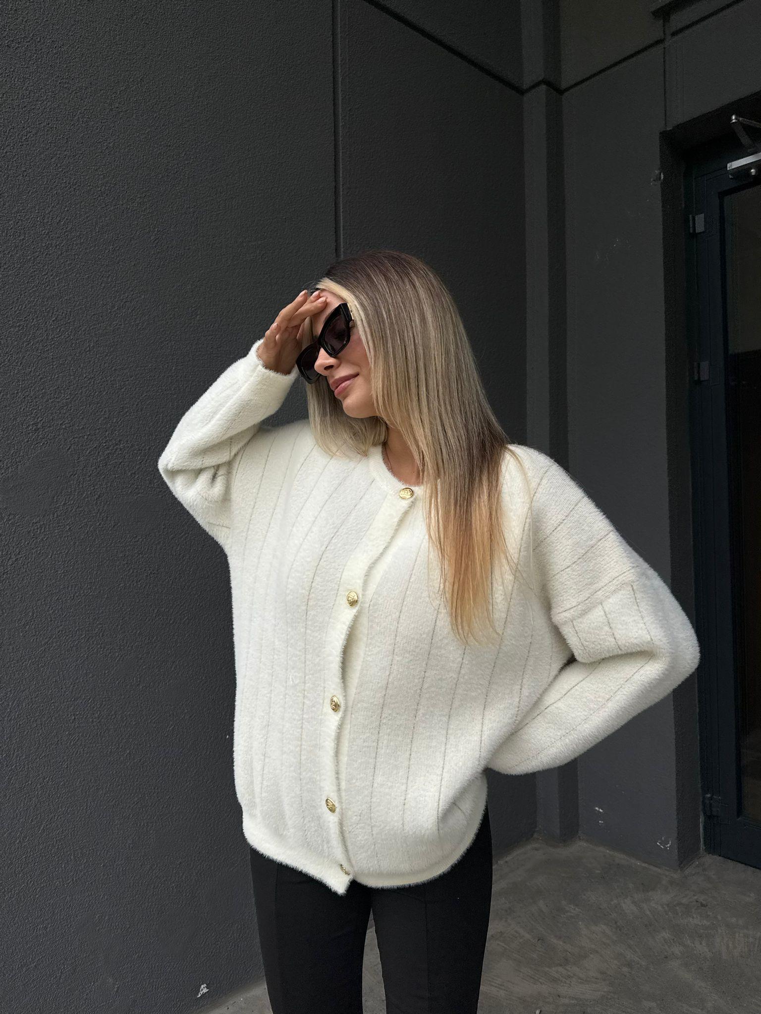 Gold Düğmeli Simli Ekru Yumoş Hırka