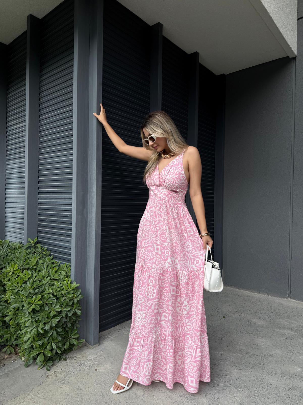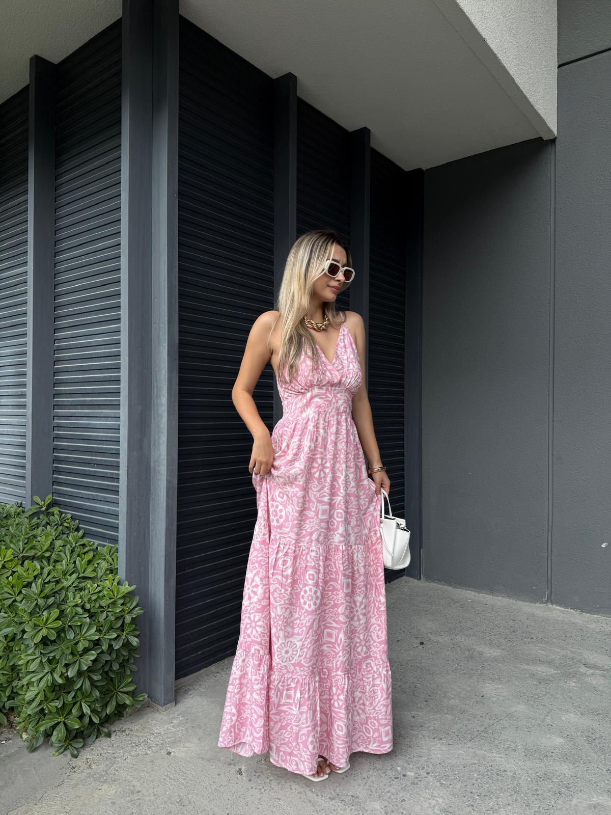 İp Askılı Bernorda Şal Desen Elbise Pembe (yelb2904grs)
