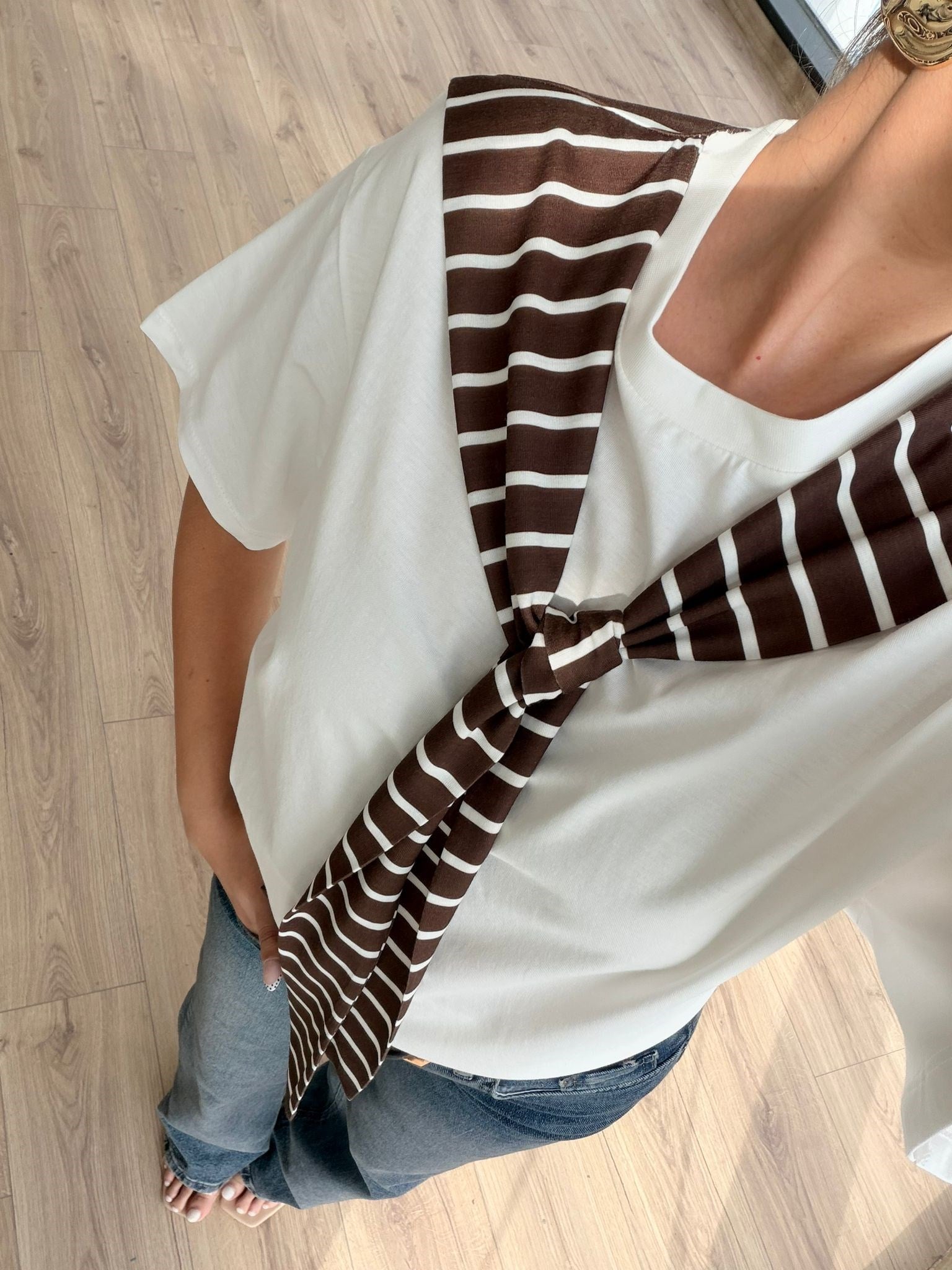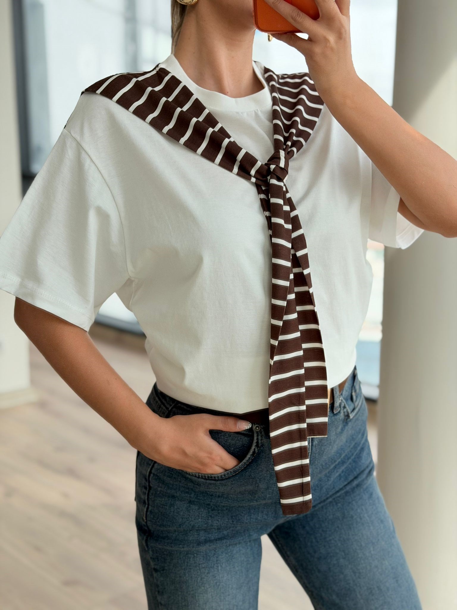 Kahverengi Çizgili Hırka Bağlama Detay Tshrt