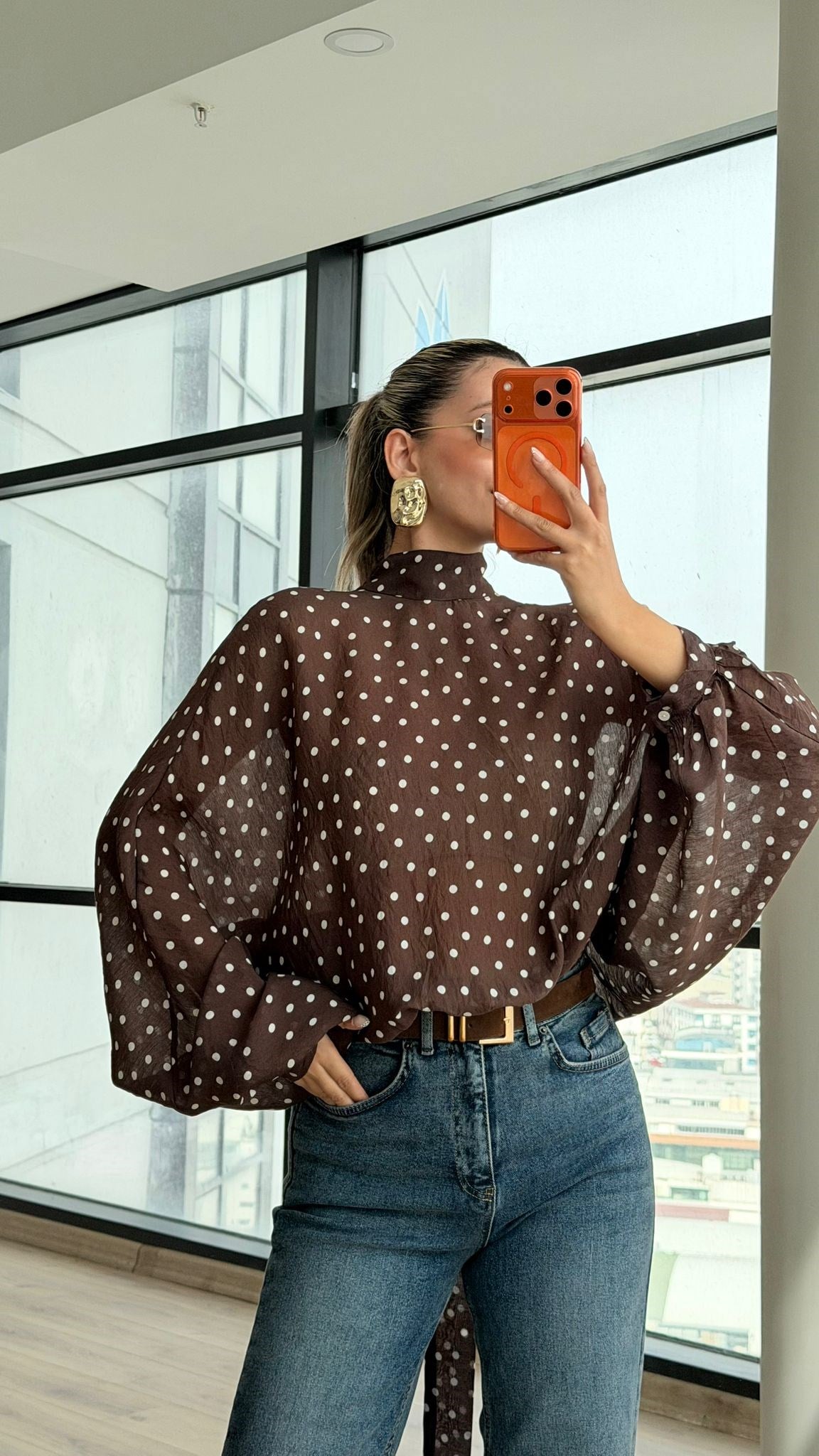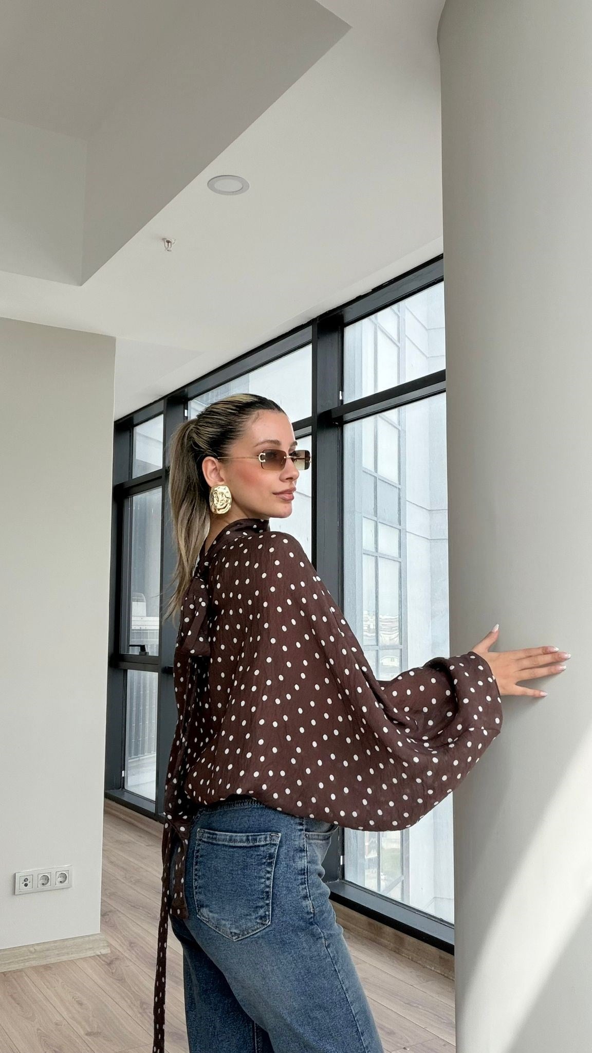 Kahverengi Vintage Puantiyeli Şifon Bluz (blz4201msnm)
