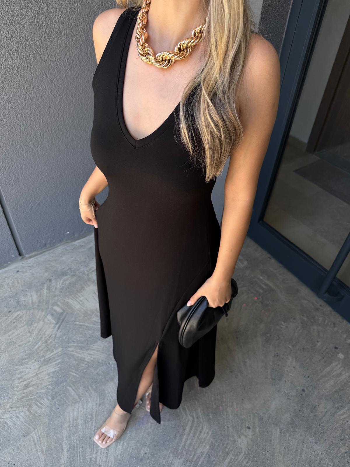Kalın Askılı V Yaka Yırtmaç Detay Viskon Elbise (yelb2270bkt)