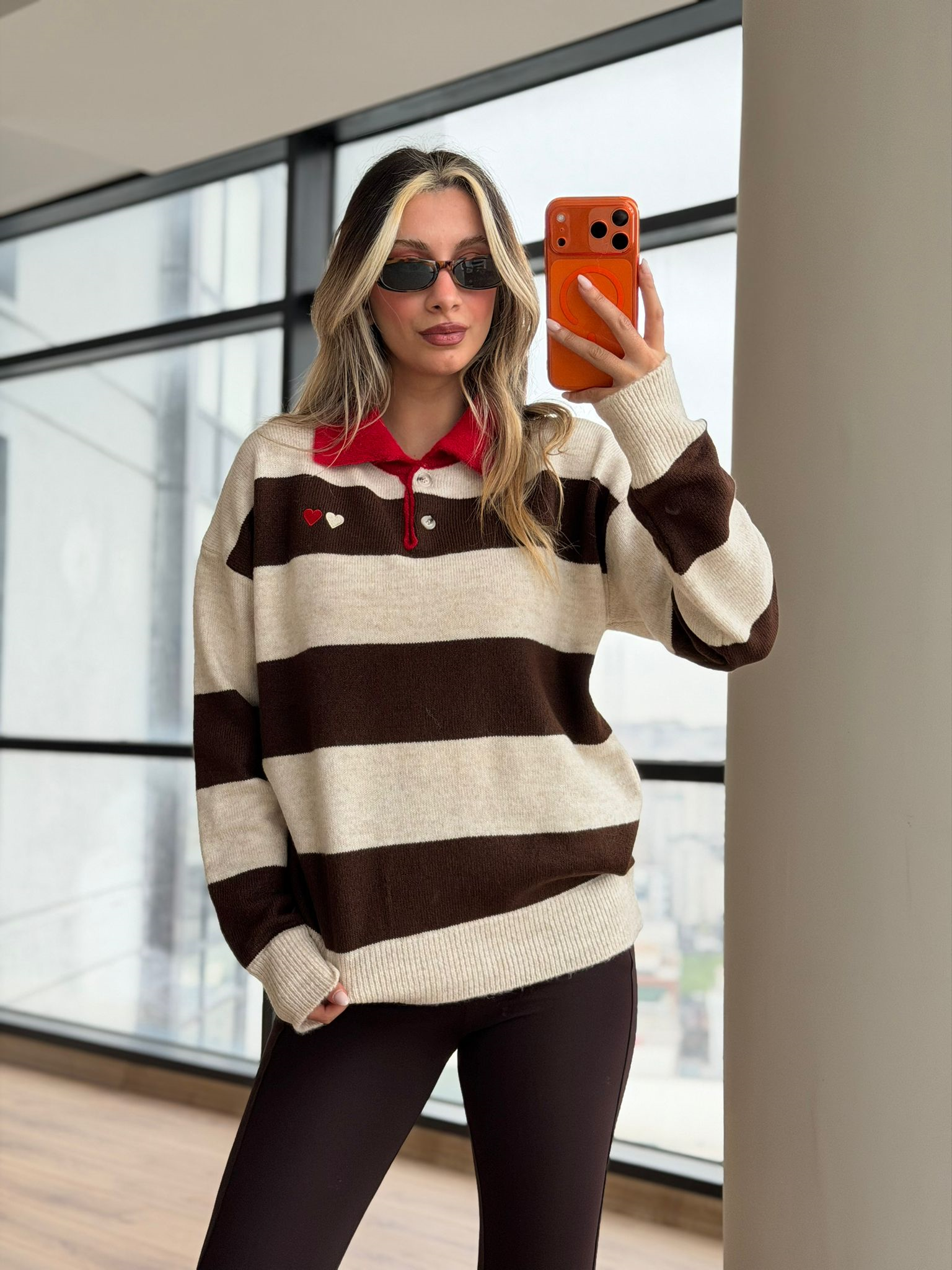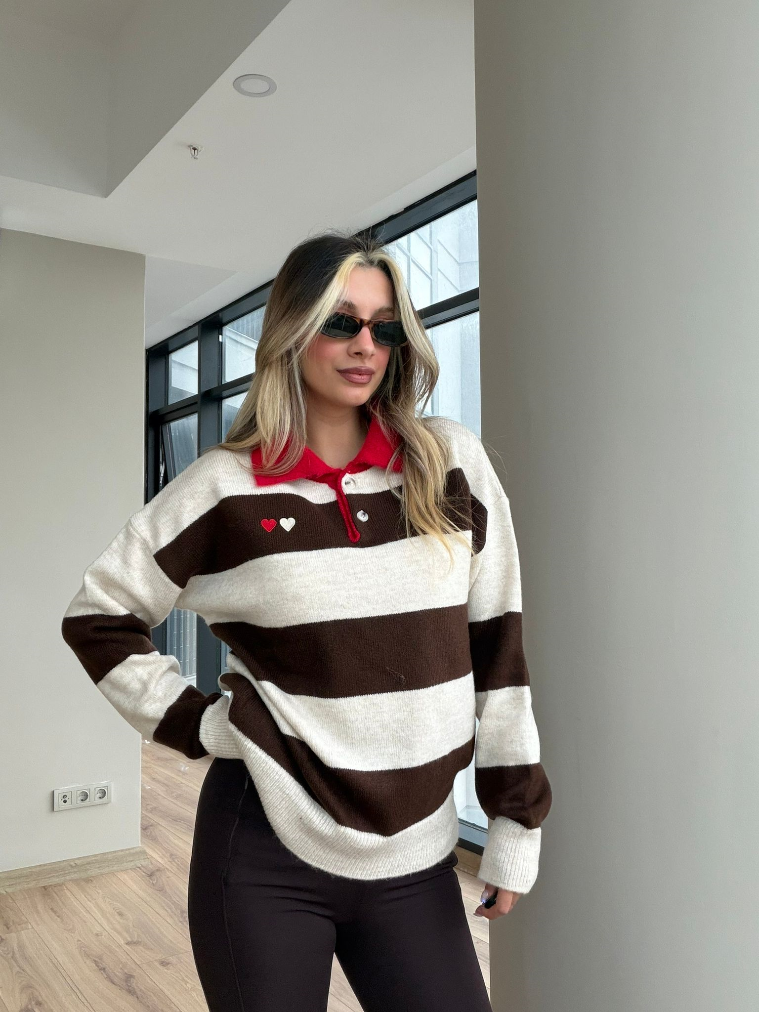 Kalp Nakışlı Kırmızı Yakalı Ekru Kahve Kazak