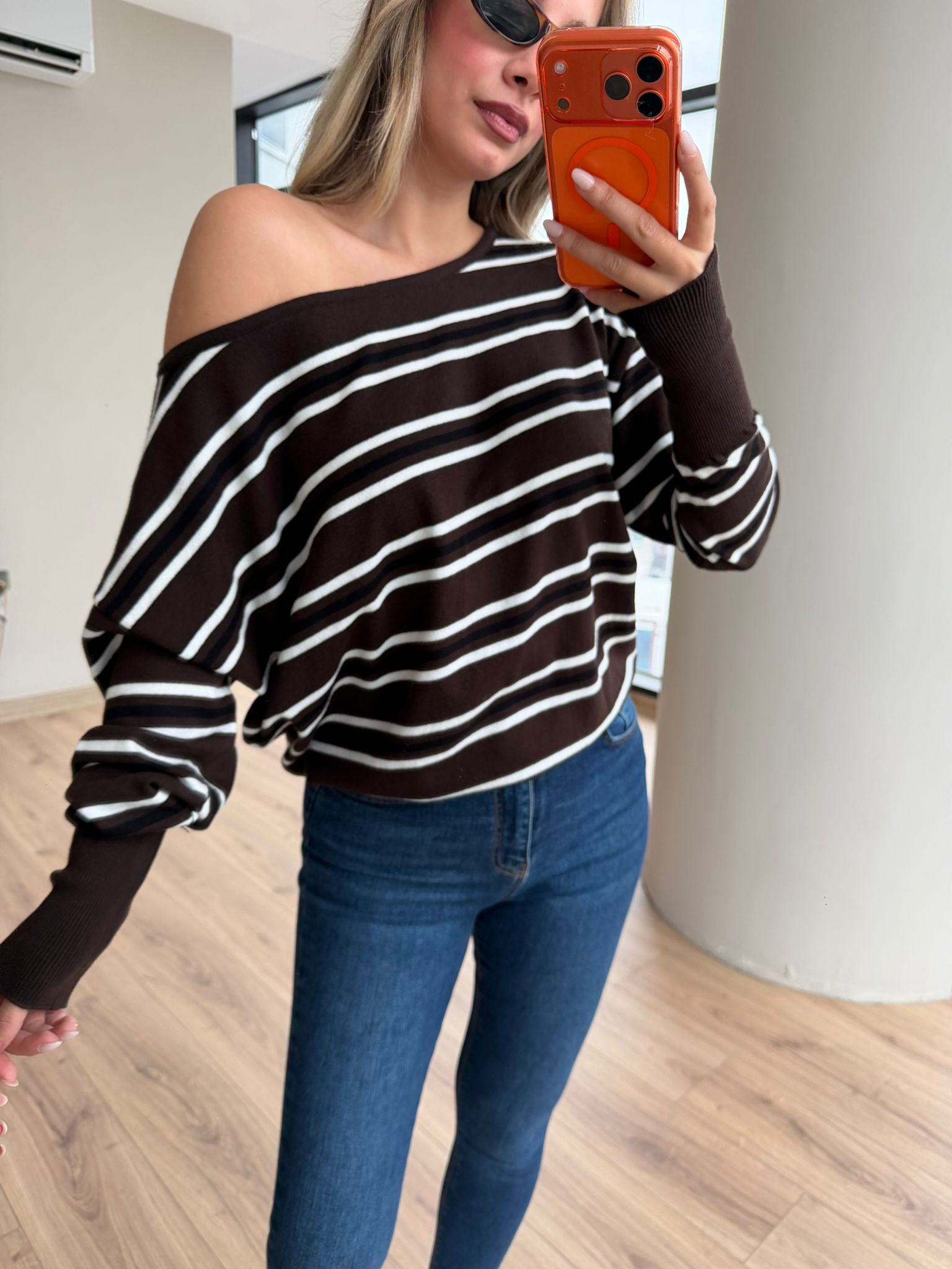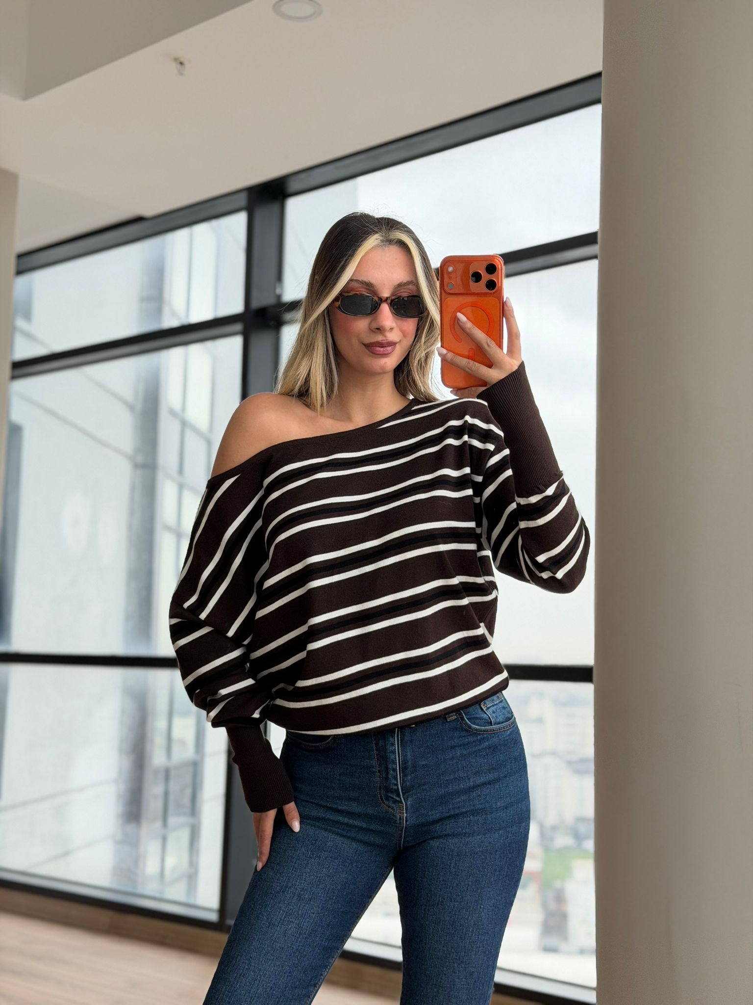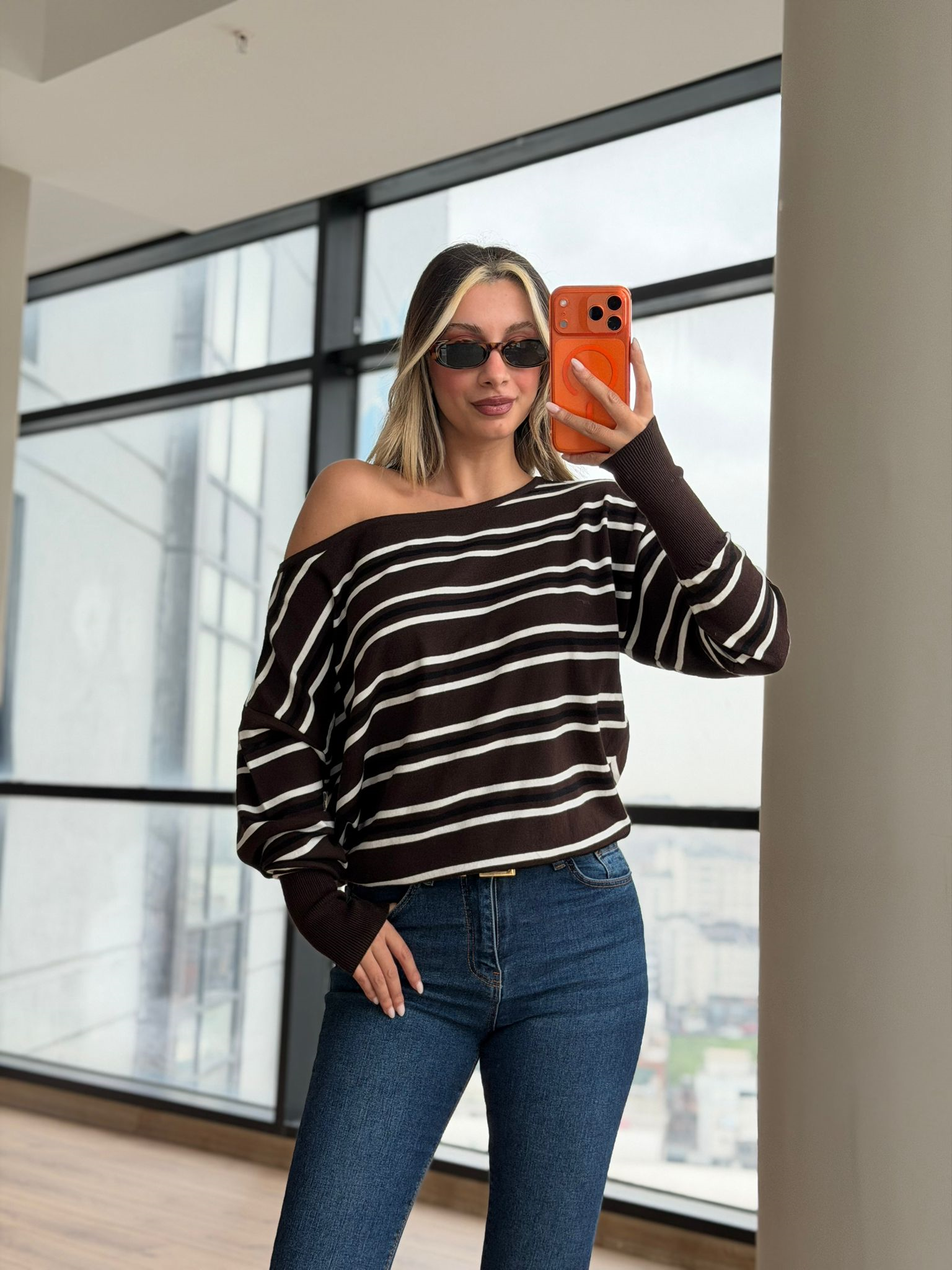 Kayık Yaka Çizgili Basic Triko Kazak Kahverengi (kzk4189rvd)