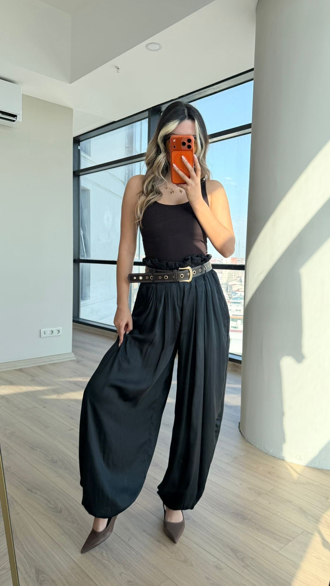 Kemerli Saten Karışımlı Şık Şalvar Pantolon Siyah