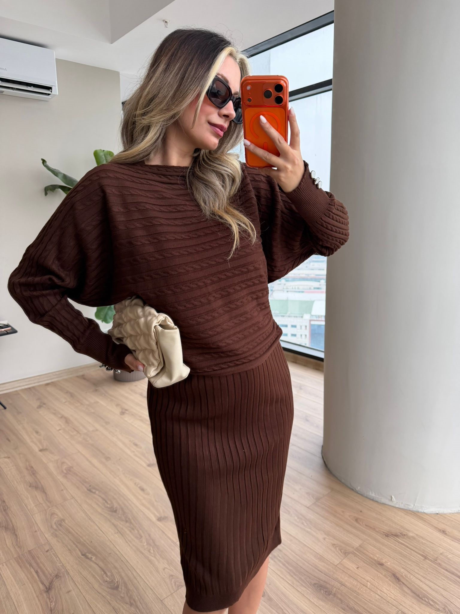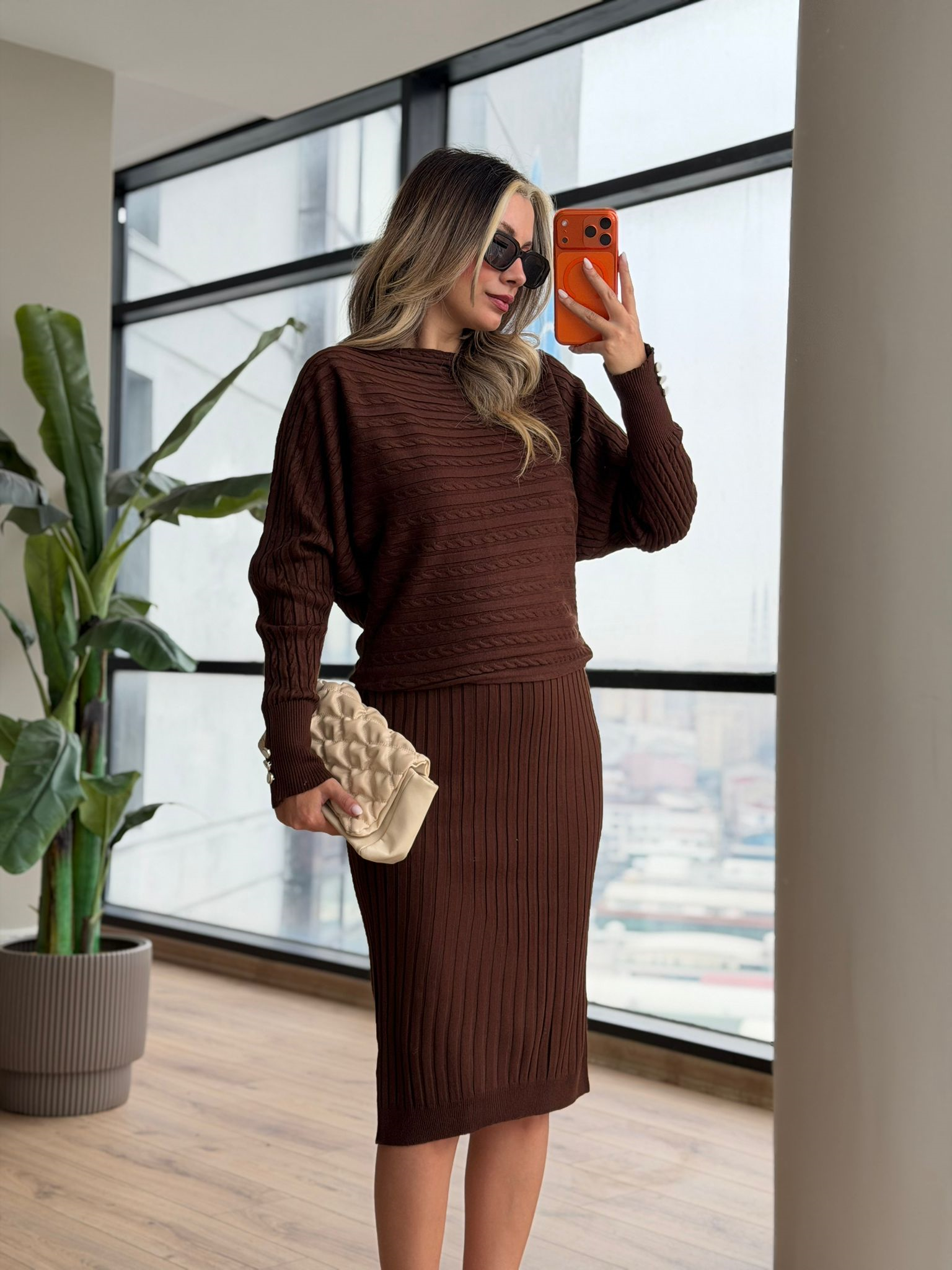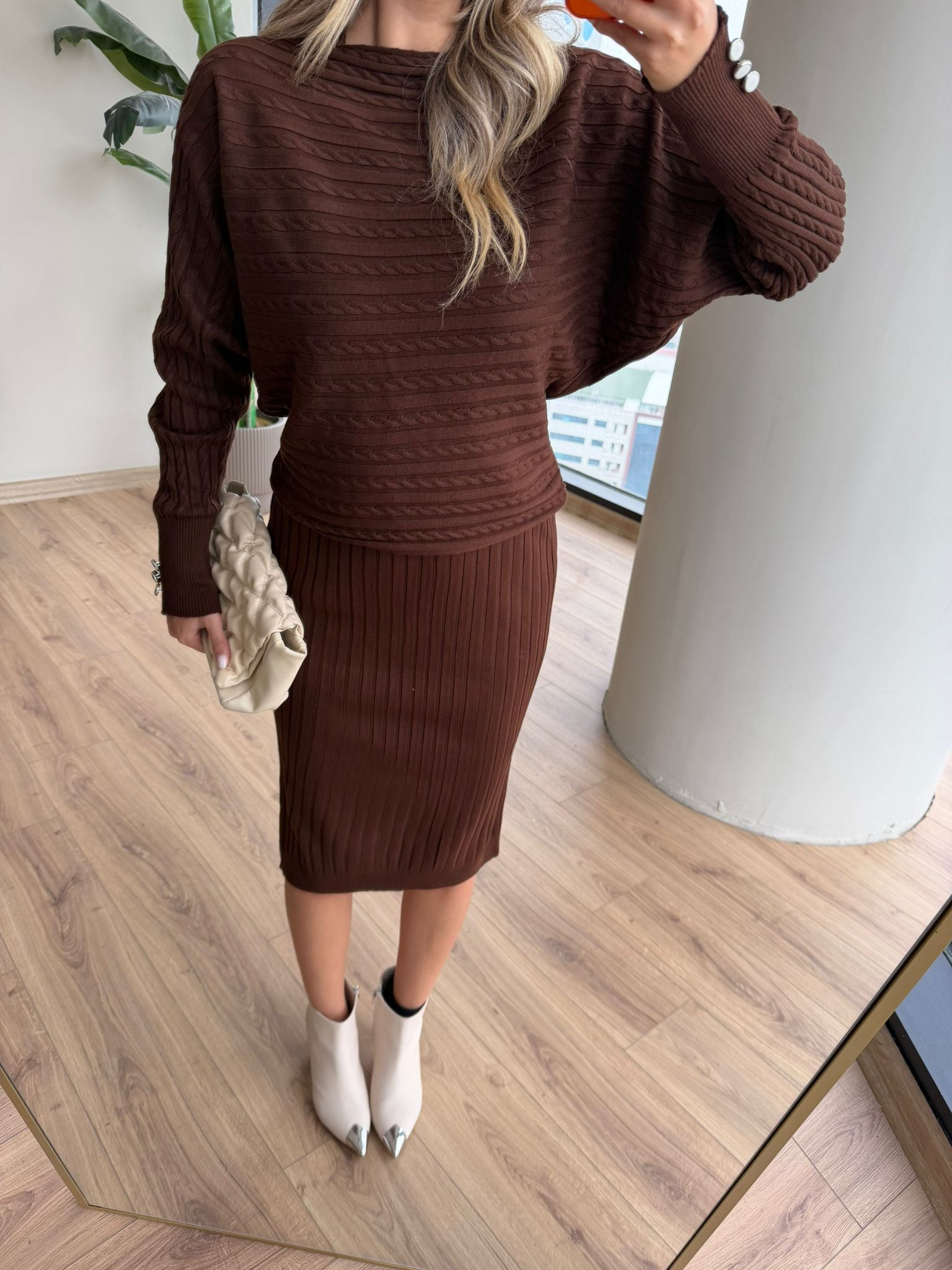 Kol İnci Düğmeli Selanik Örgü Kazaklı Elbise Kahverengi (kelb4156rvd)