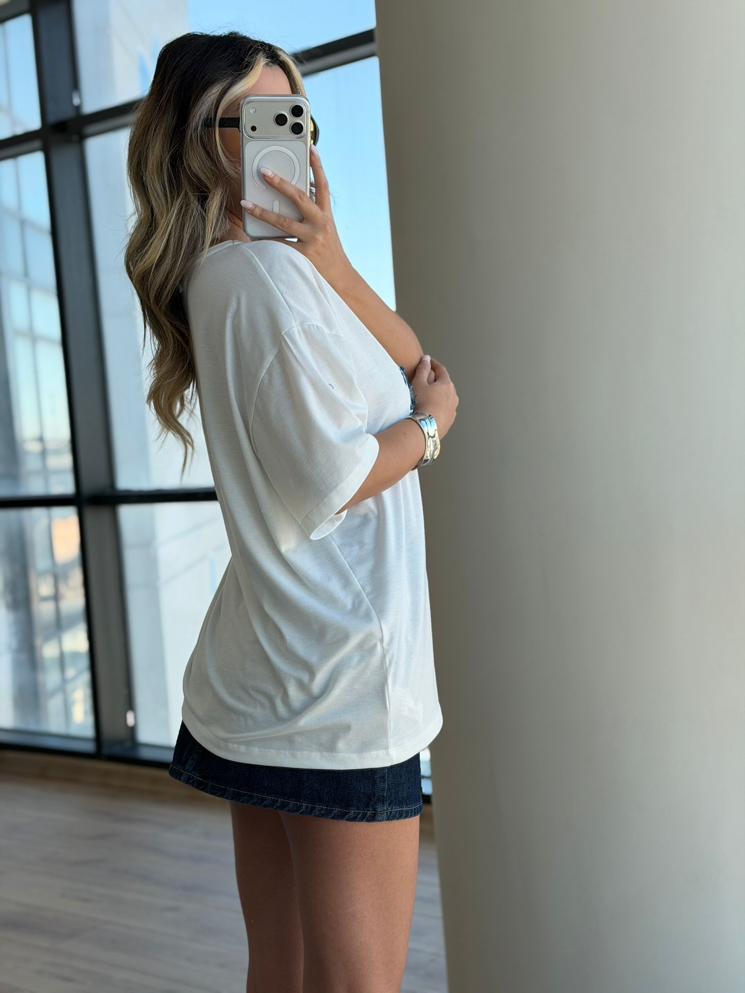 Modern ve genç stilin öne çıkan parçalarından biri olan yazı baskılı oversize beyaz tişört, gün boyu konfor sağlarken kombinlerinize spor şıklık katar. Jean, etek ve şortlarla kolayca kombinlenebilir.