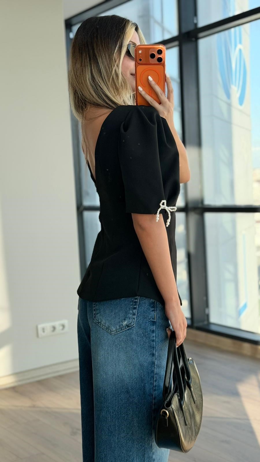 Kolları İnci Fiyonk Bluz Siyah (blz4257dk)