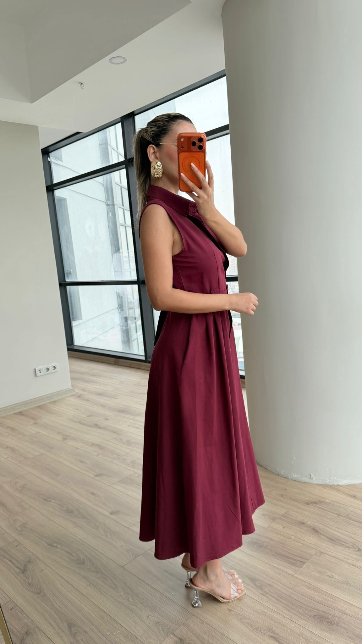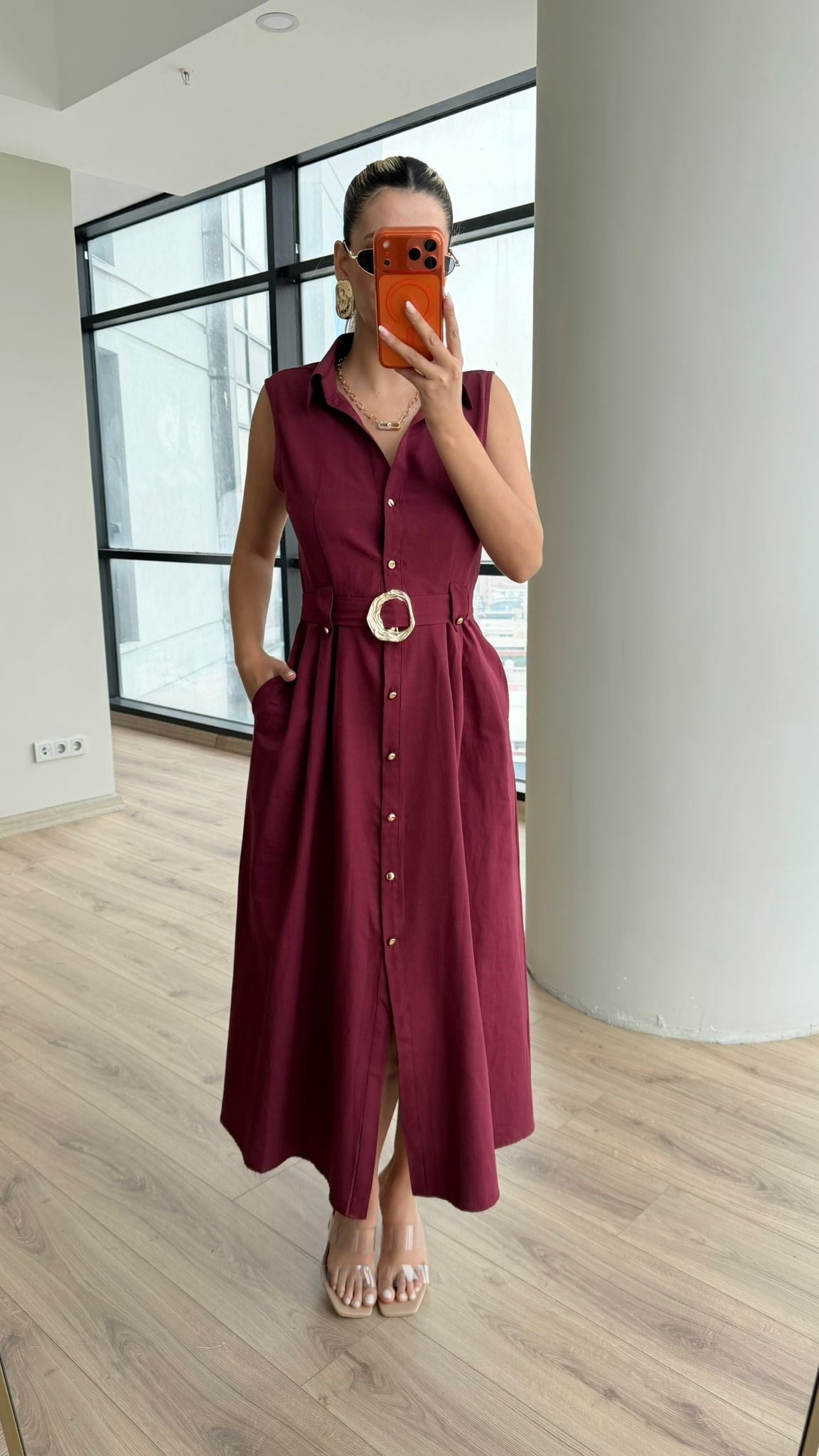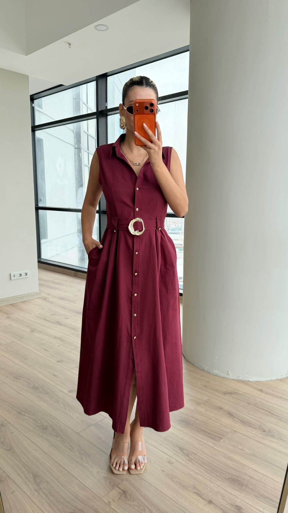 Ürün Özellikleri:GÖMLEK YAKA BOYDAN DÜĞMELİ KOLSUZ KEMERLİ ELBİSE