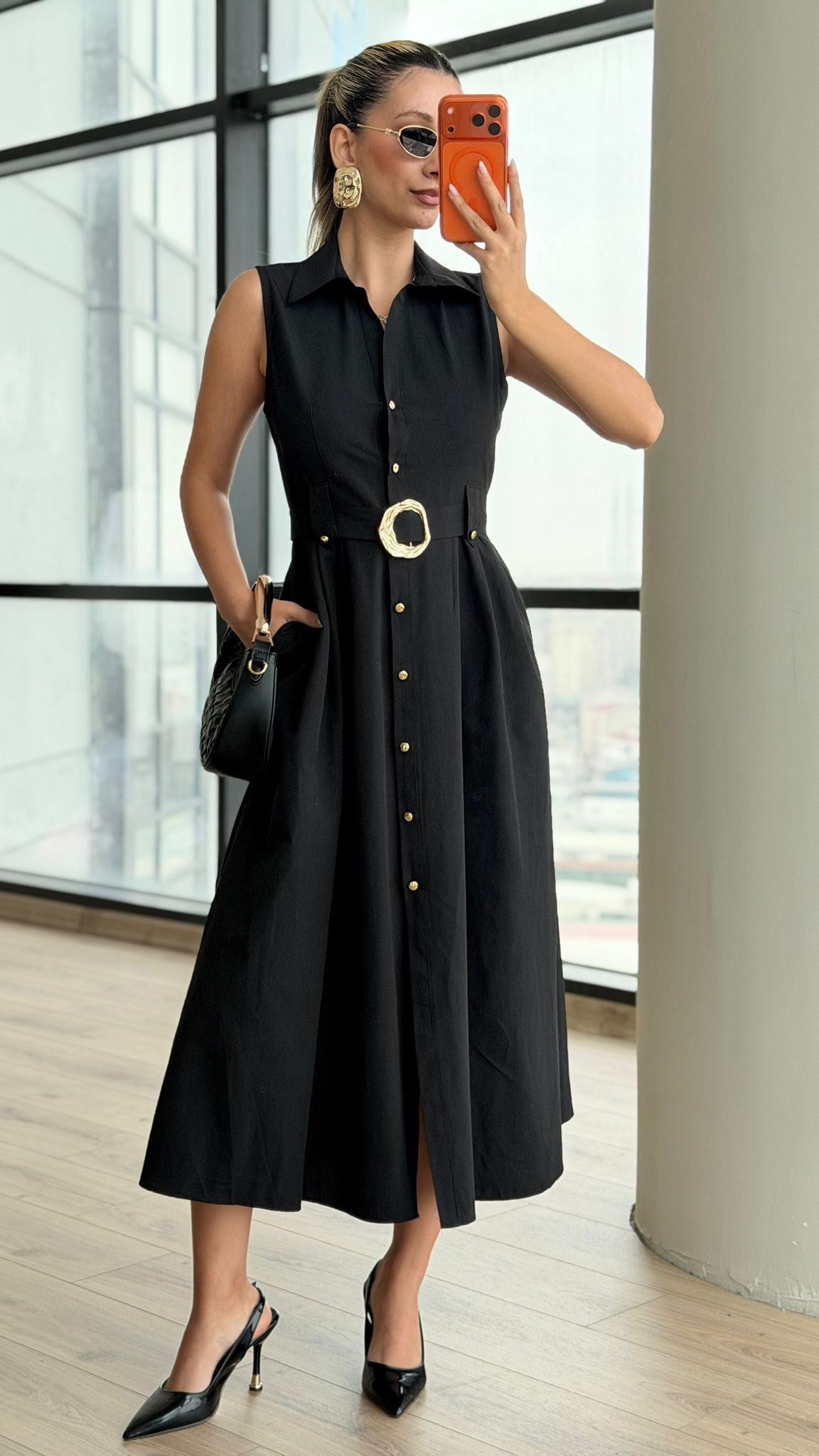 Ürün Özellikleri:GÖMLEK YAKA BOYDAN DÜĞMELİ KOLSUZ KEMERLİ ELBİSE