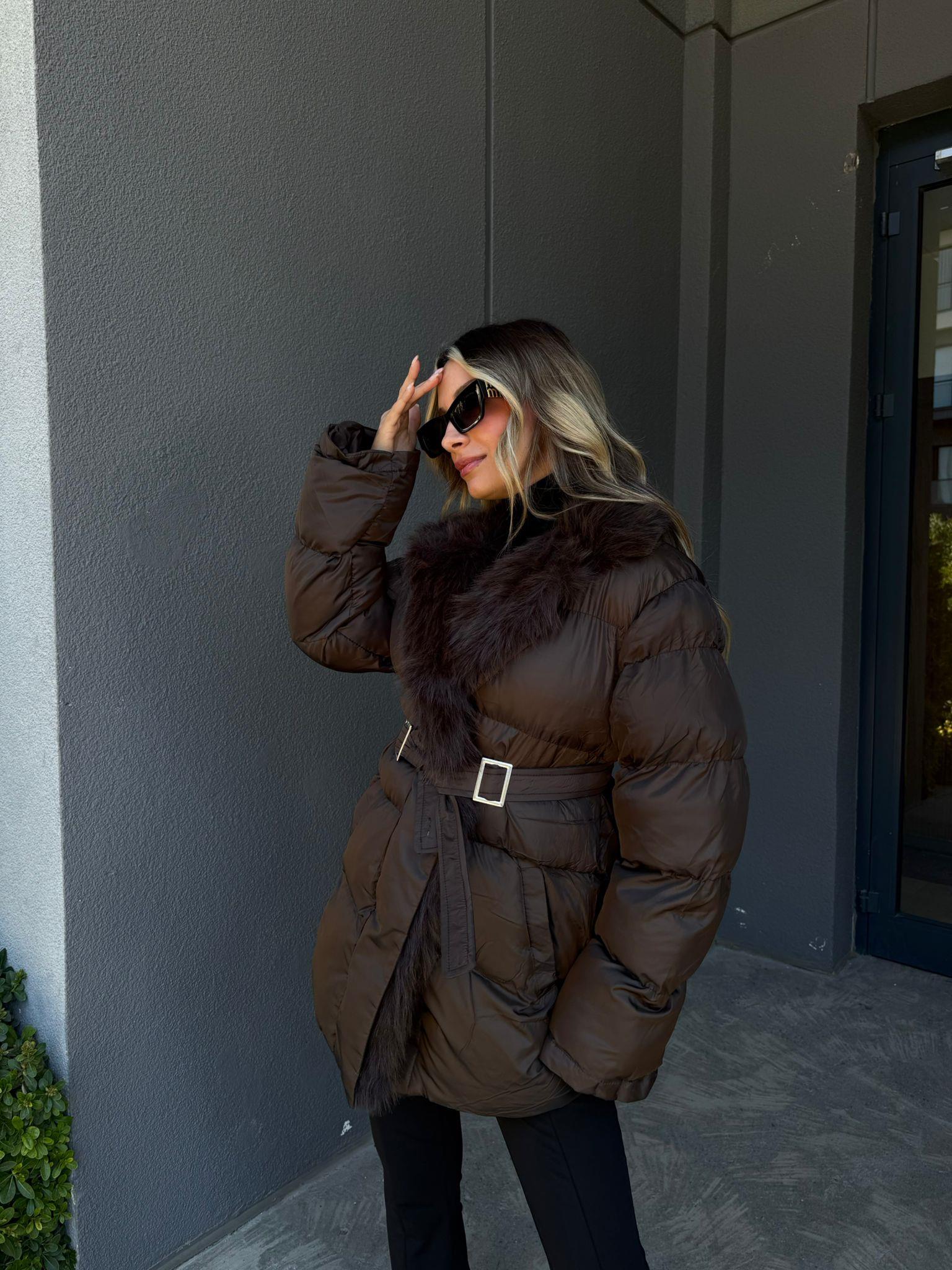 Kürk Yakalı Şişme Mont Kahverengi