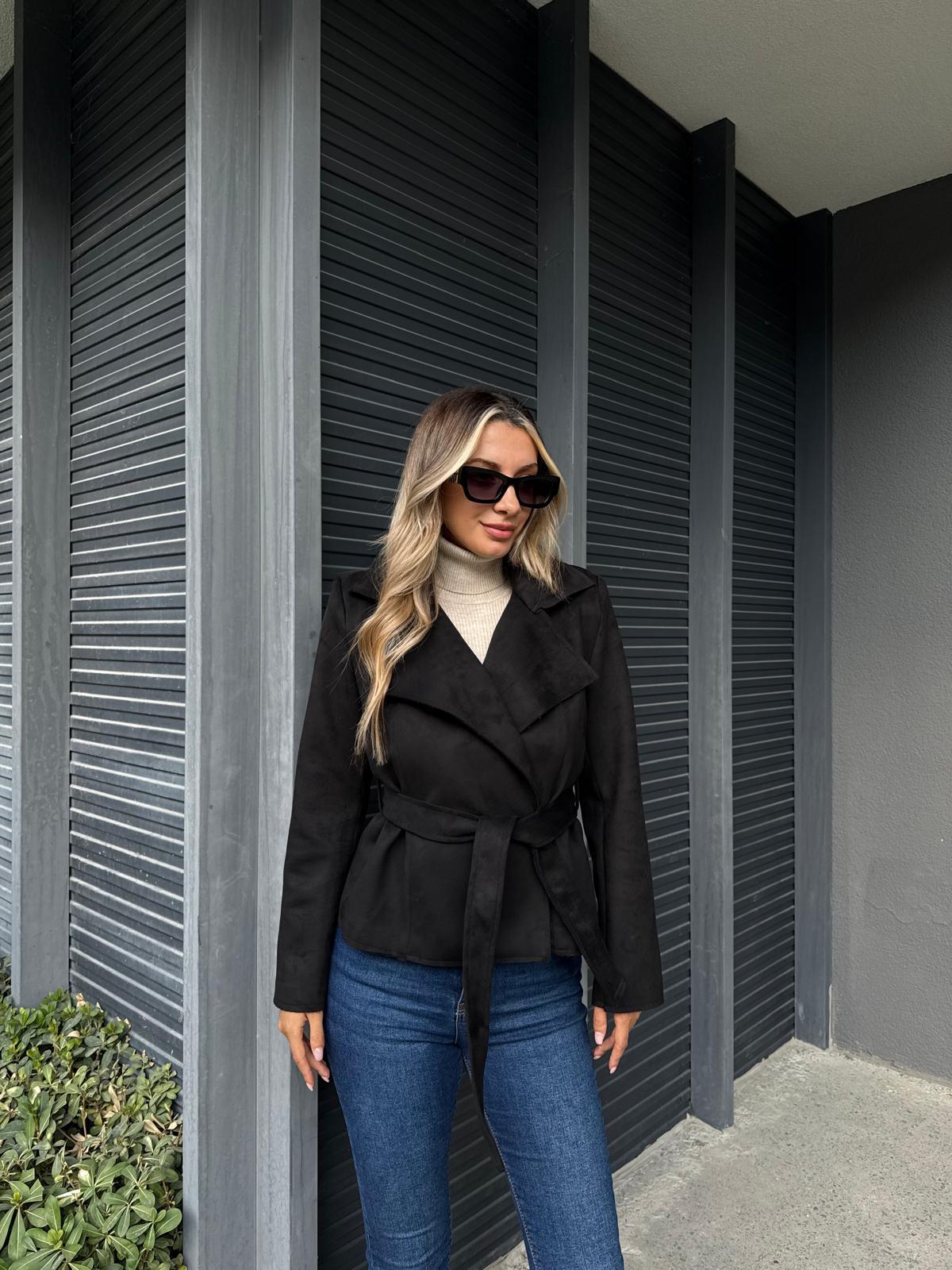 Kuşaklı Kruvaze Süet Ceket Siyah (ckt3052prr)
