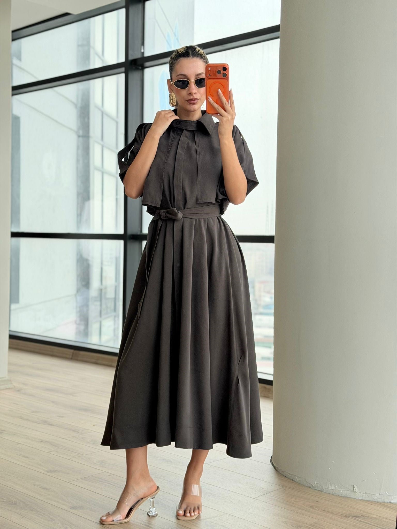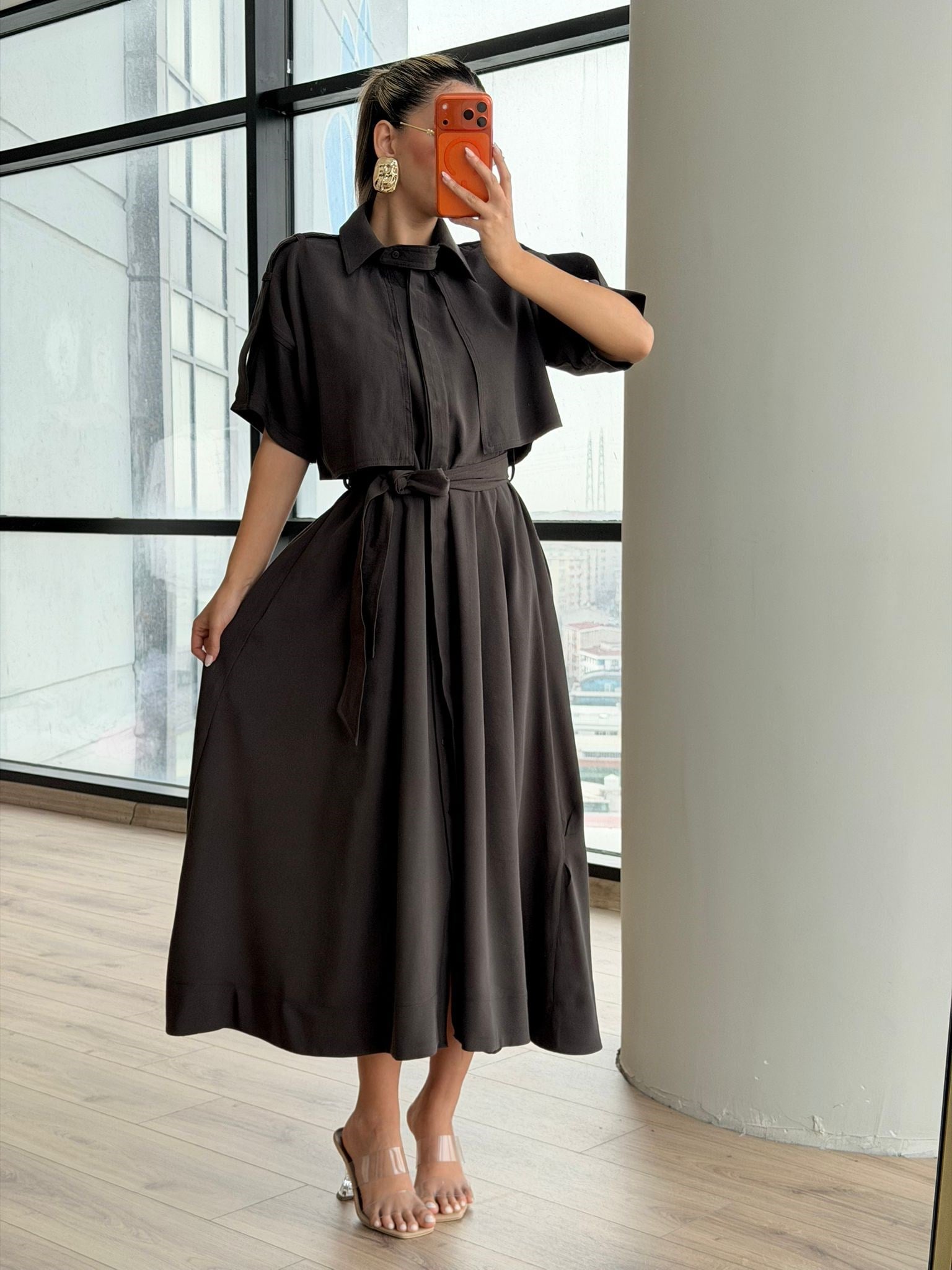 Görselde S beden kullanılmıştır. Ortalama boy uzunluğu: 130 cm. %70 polyester %30 pamuk kumaştır. Ceplidir. Önden düğmelidir.