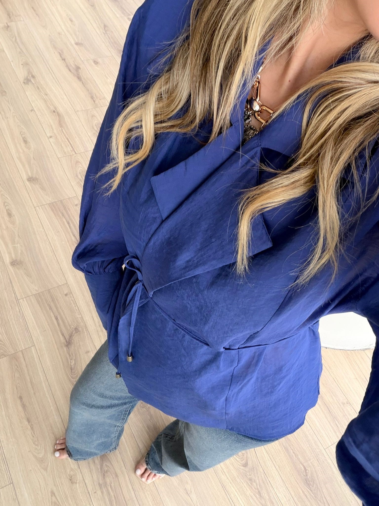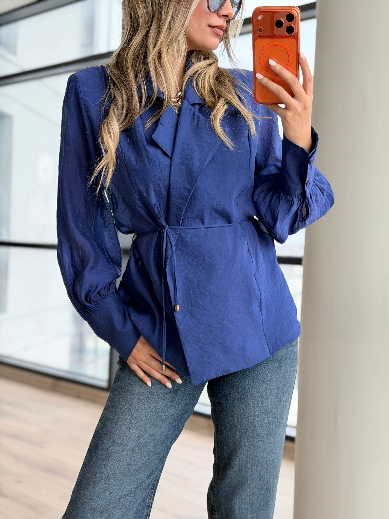 Lacivert Balon Kol Hafif Dokulu Gömlek