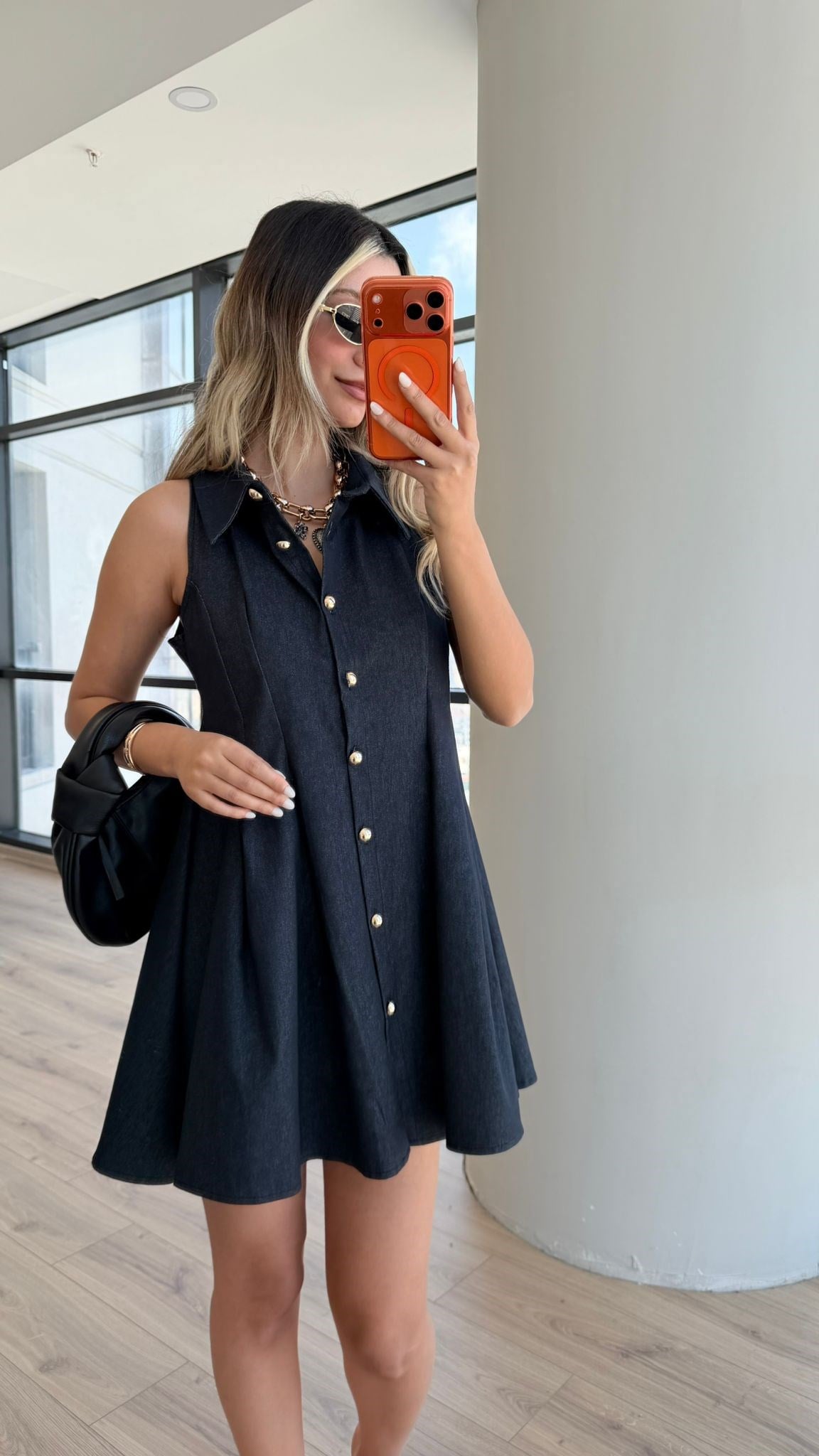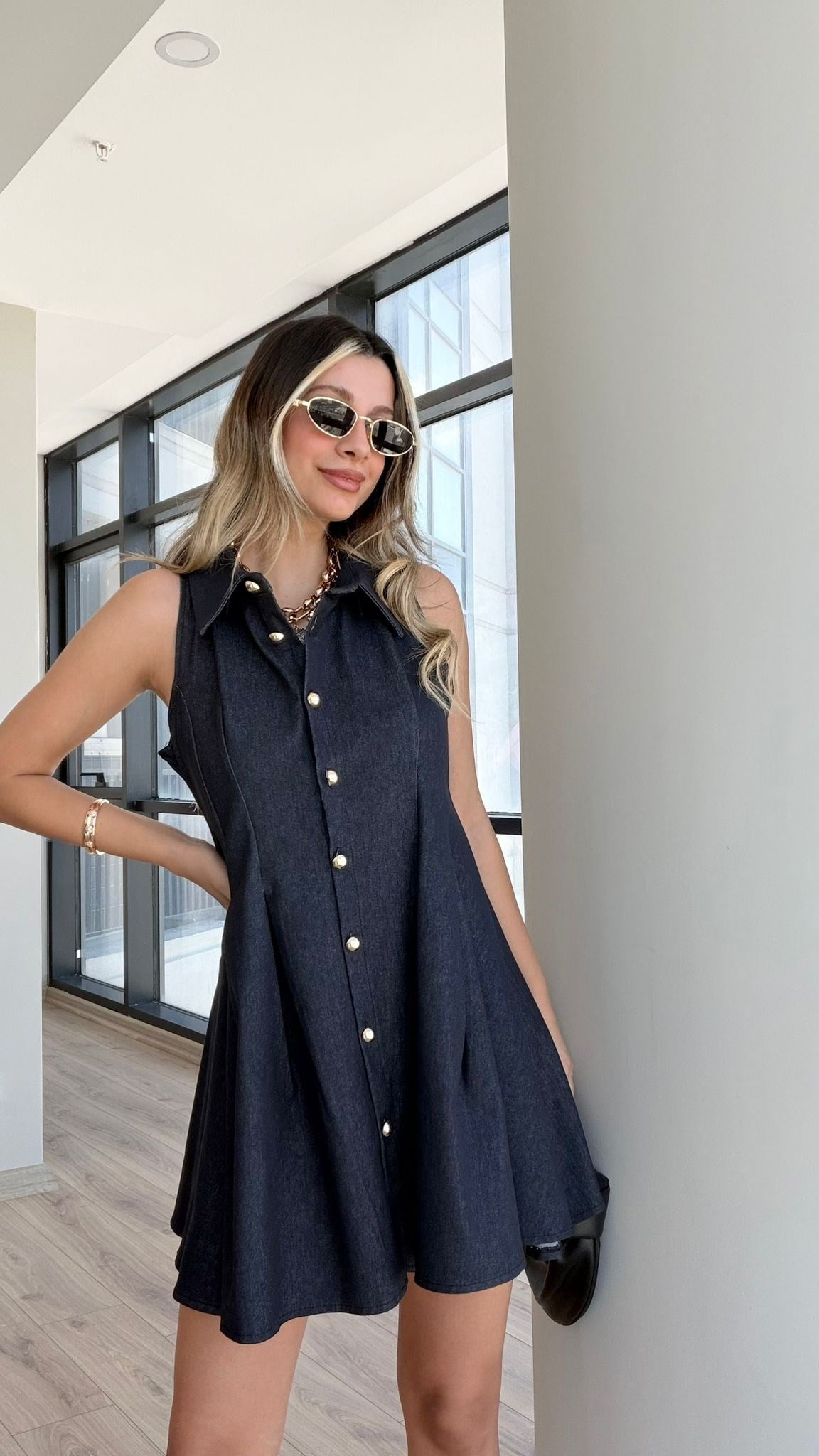 Lacivert Gold Düğmeli Çan Elbise (yelb4282kd)