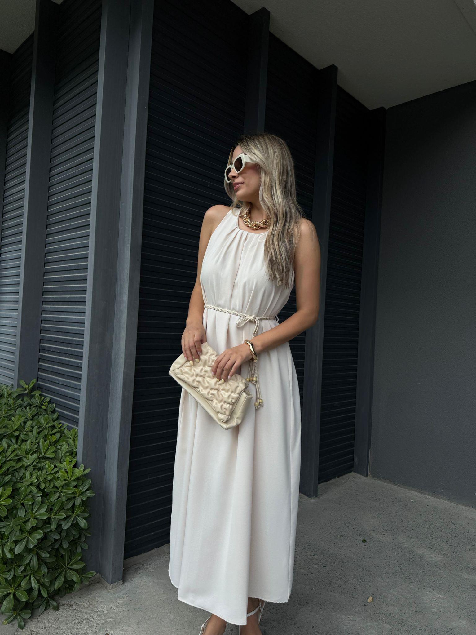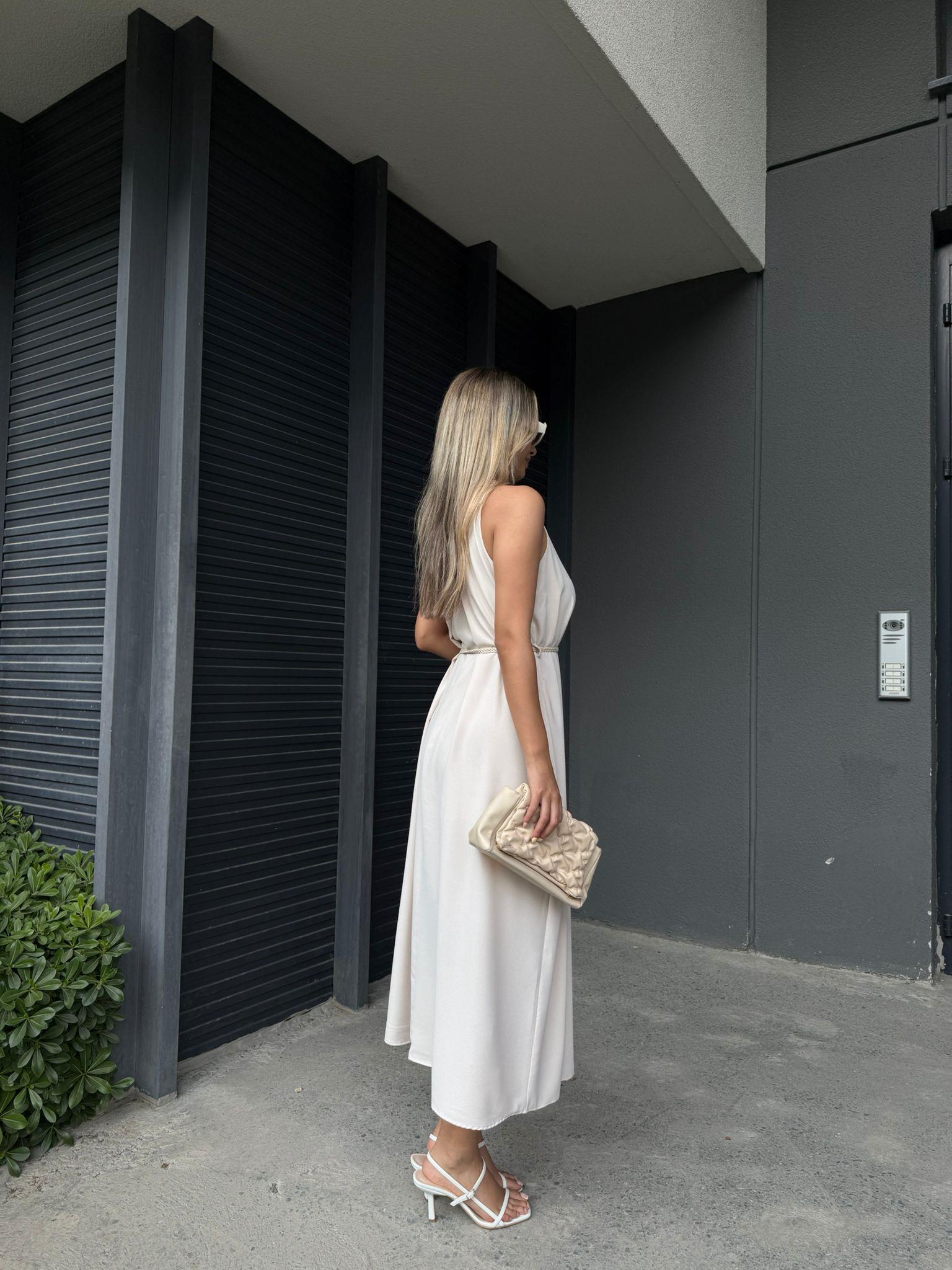 Lisarli İp Kemerli Sıfır Kol Krem Elbise