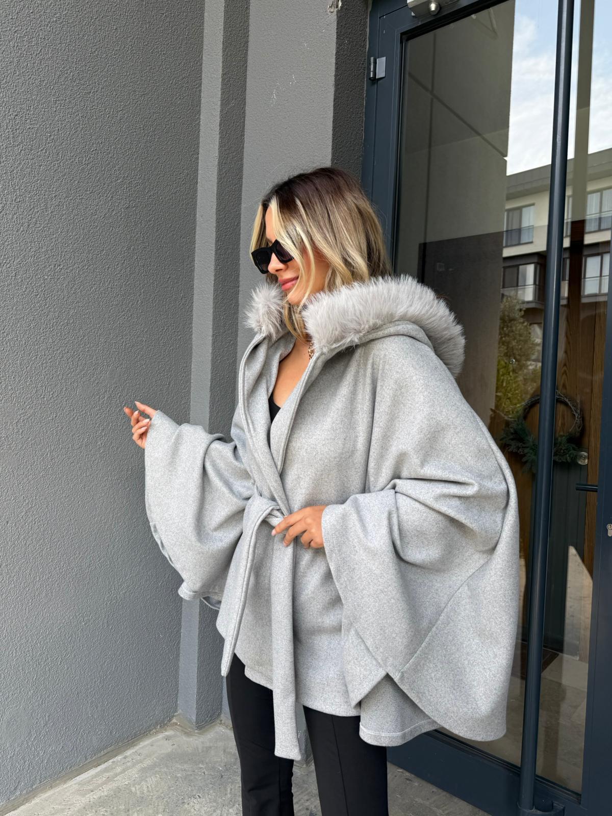 Luvina Muadil Kürk Kapüşonlu Kaşe Panço Gri (kbn3108sist)