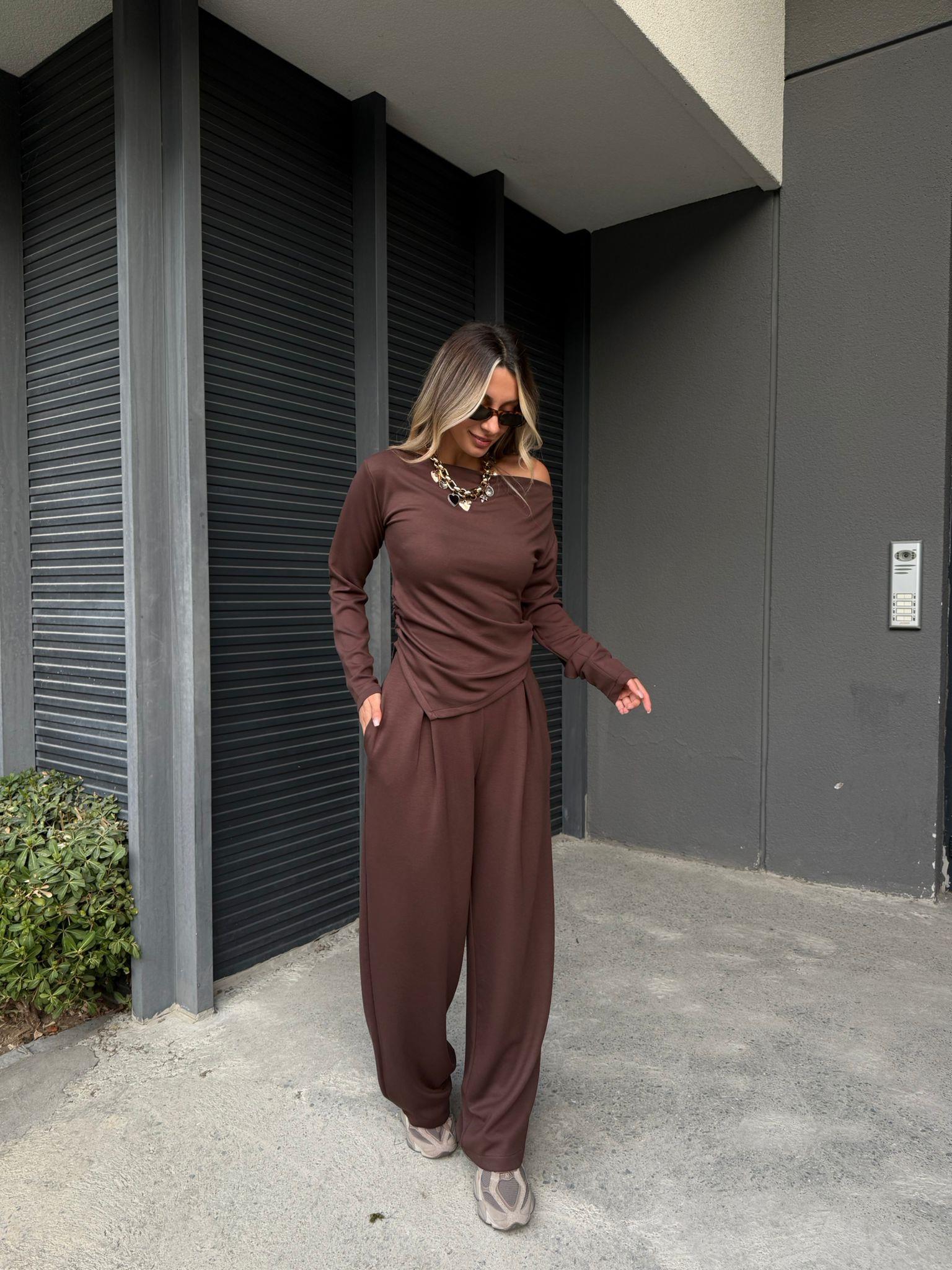 Marbella Kadın Omzu Açık Drapeli Asimetrik Bluz & Bol Paça Pantolon Takım Kahverengi (tkm3089rcd)