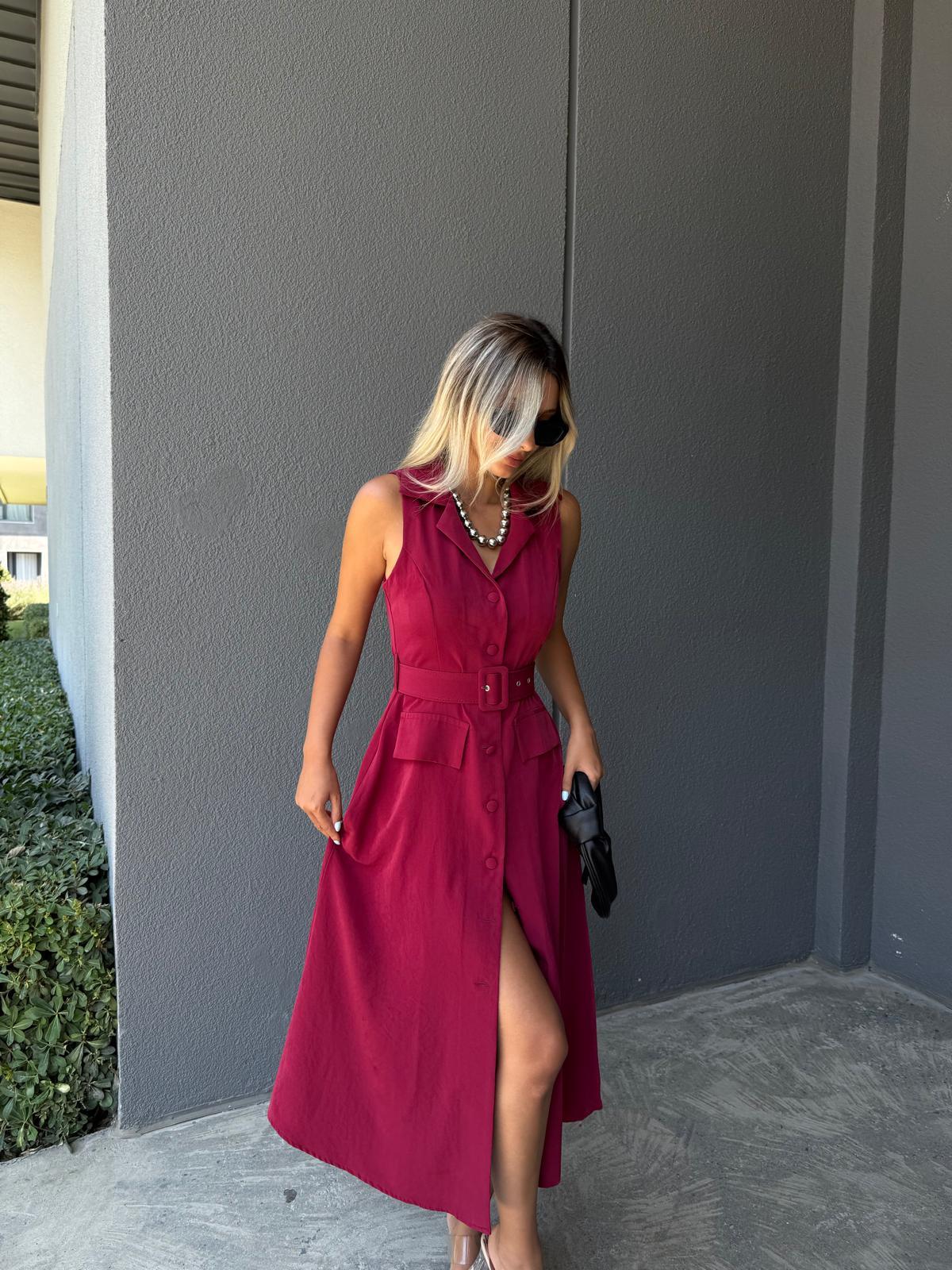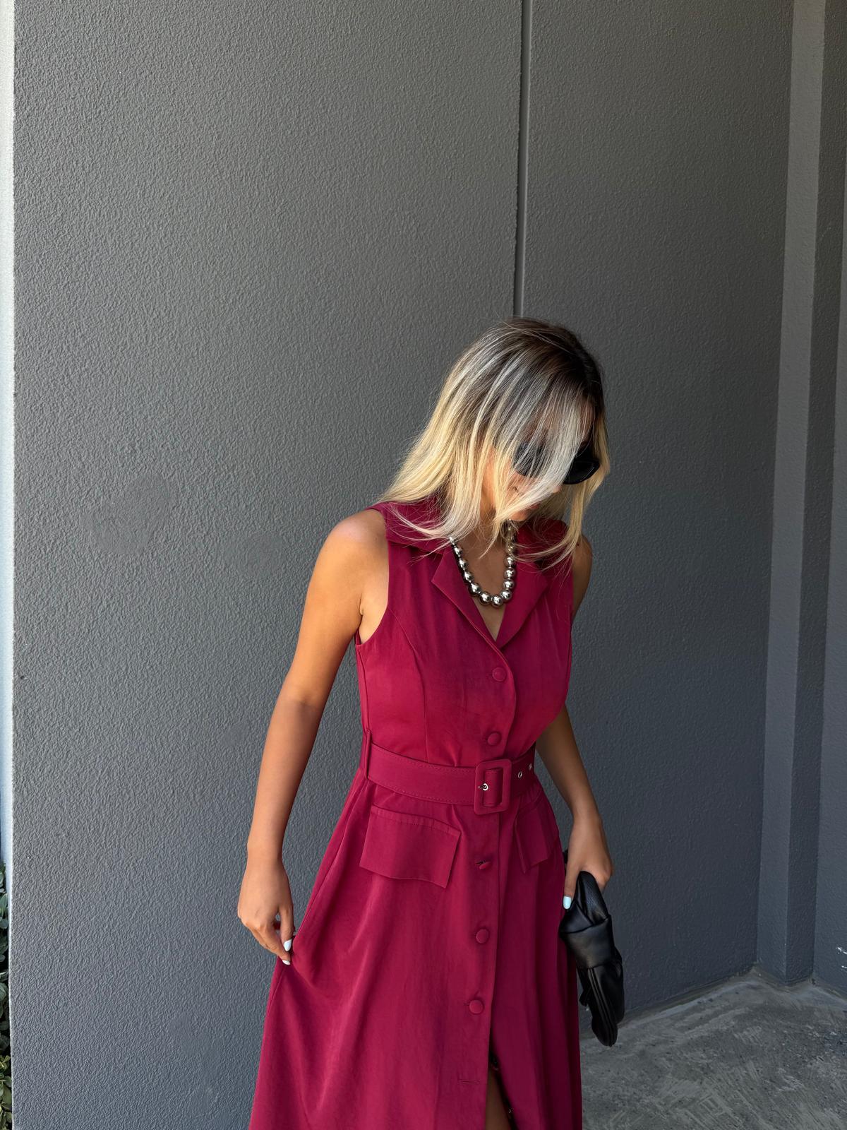 Maria Tensel Kumaş Kemerli Elbise Bordo