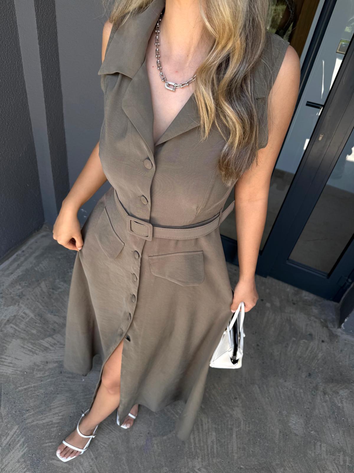 Megan Tensel Kumaş Düğmeli Kemerli Maxi Elbise Haki