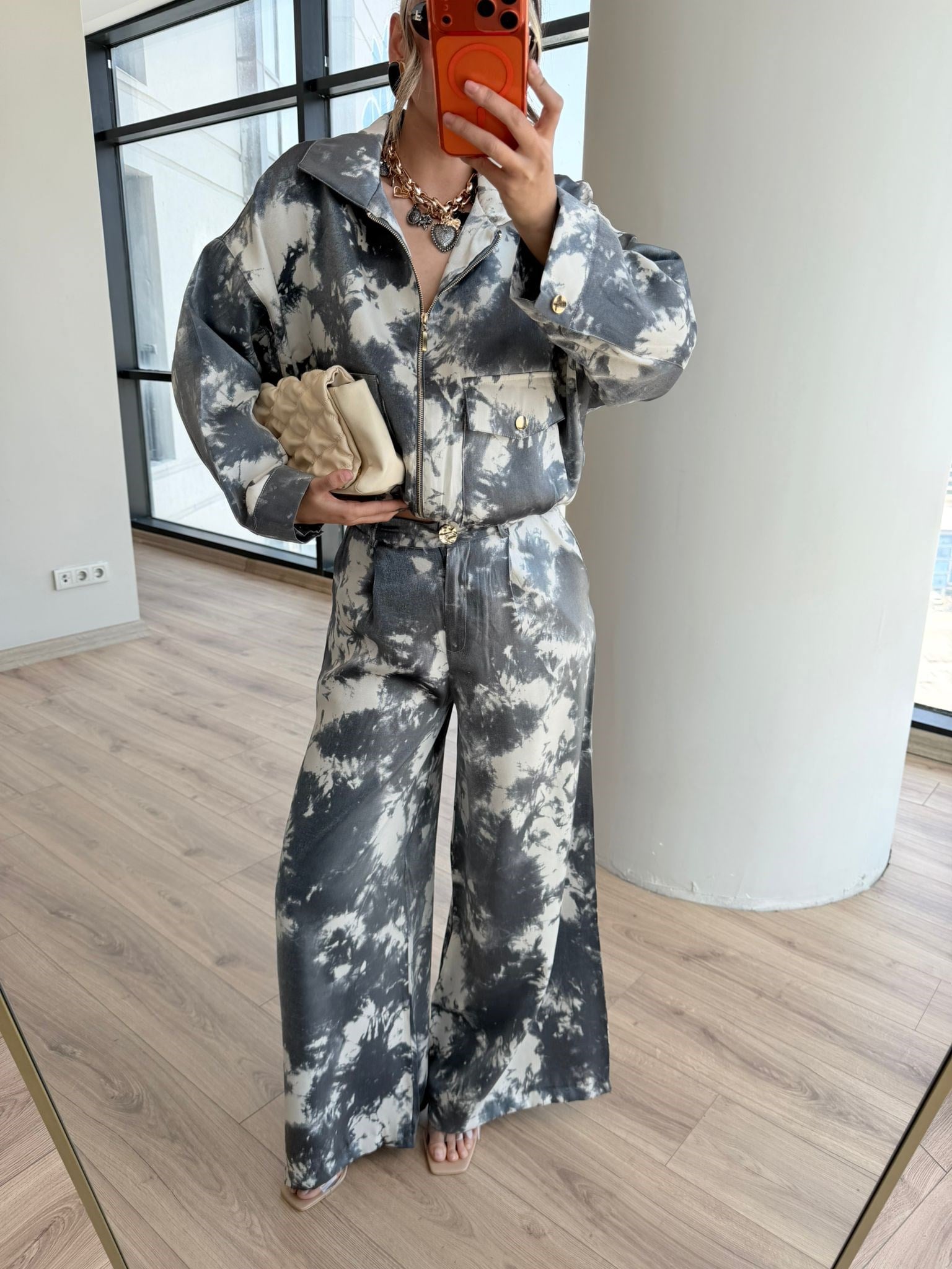 Modern ve iddialı tarzı ile öne çıkan batik desenli ceket pantolon takım, şehir stiline güçlü bir dokunuş katar.