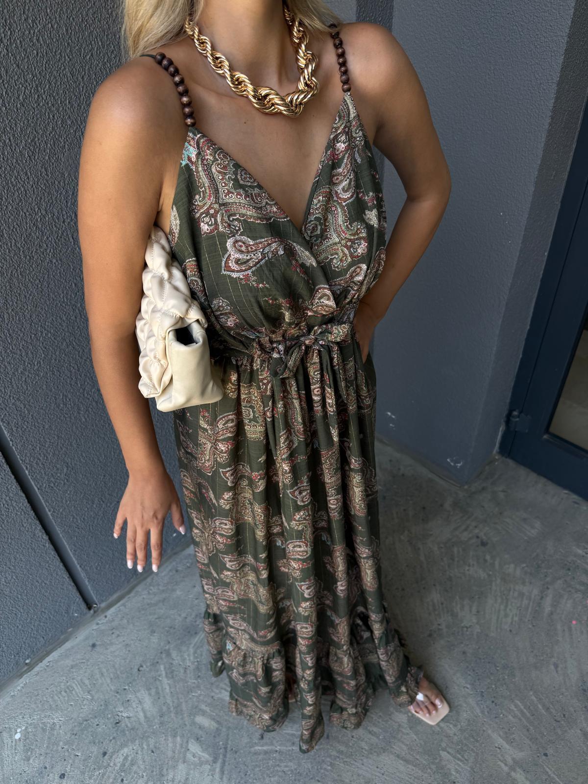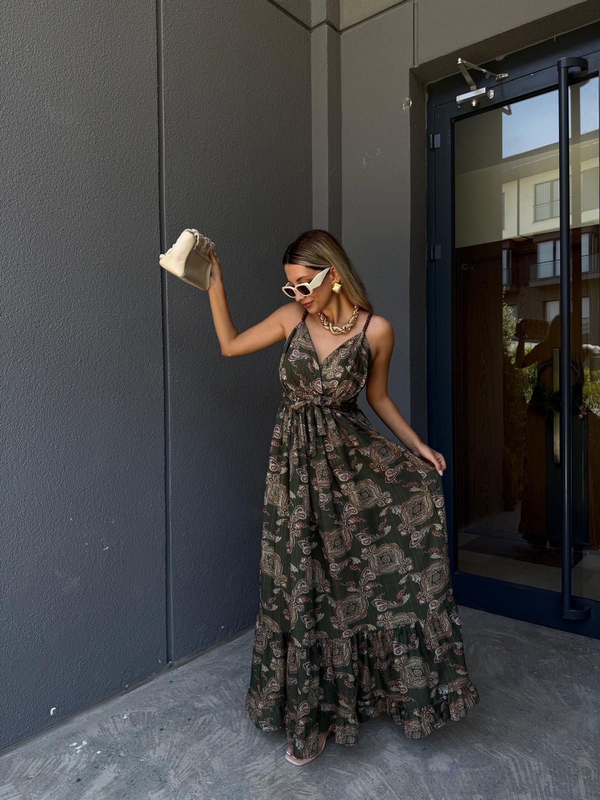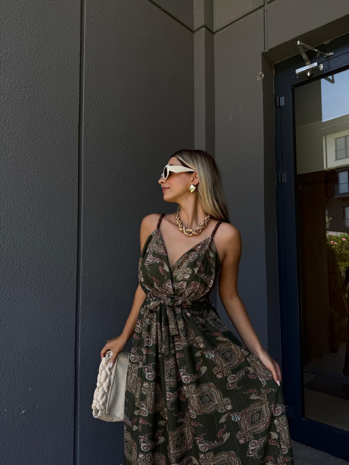 Oltida Şal Desen Yeşil İp Askı Elbise