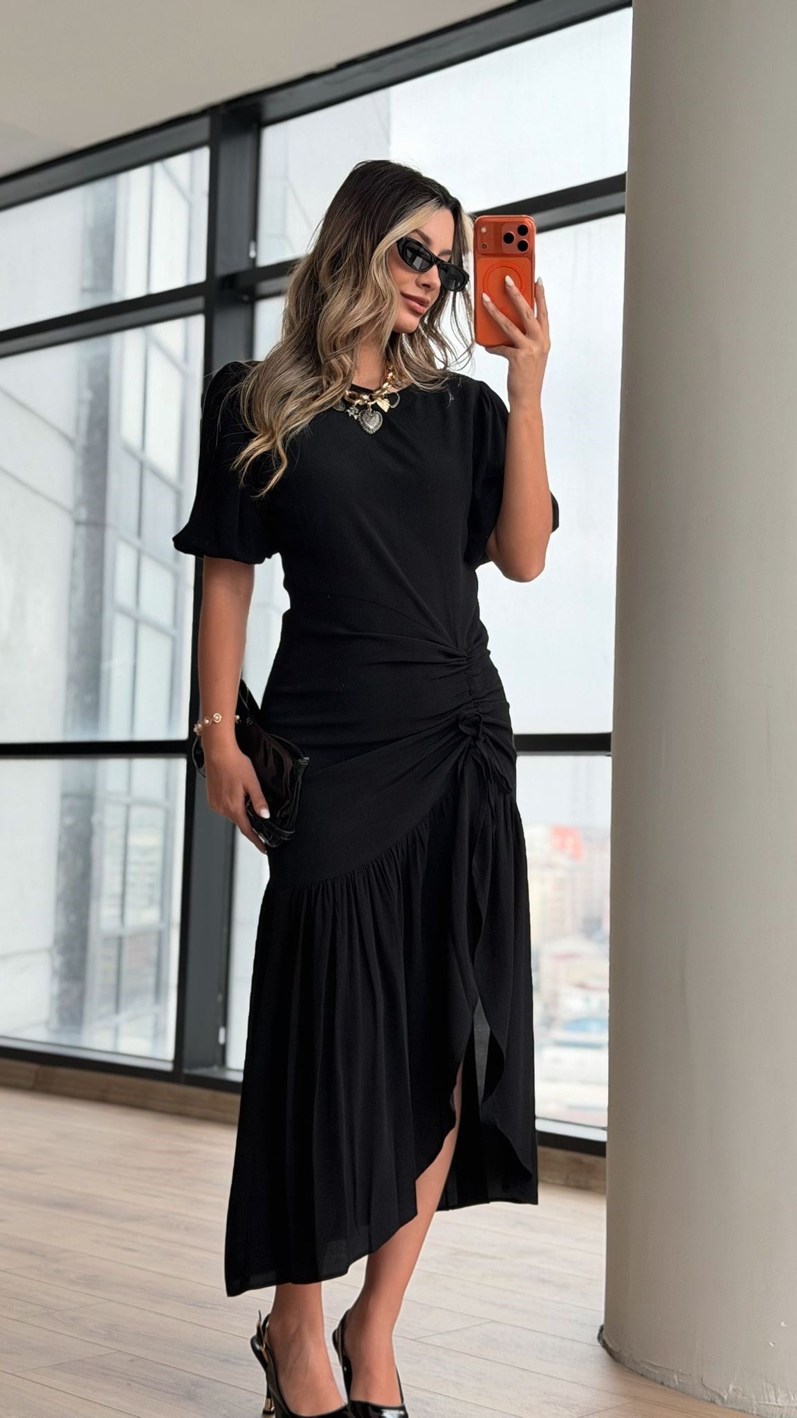 Orijinal M.D Etiketli Etek Büzgülü Siyah Elbise