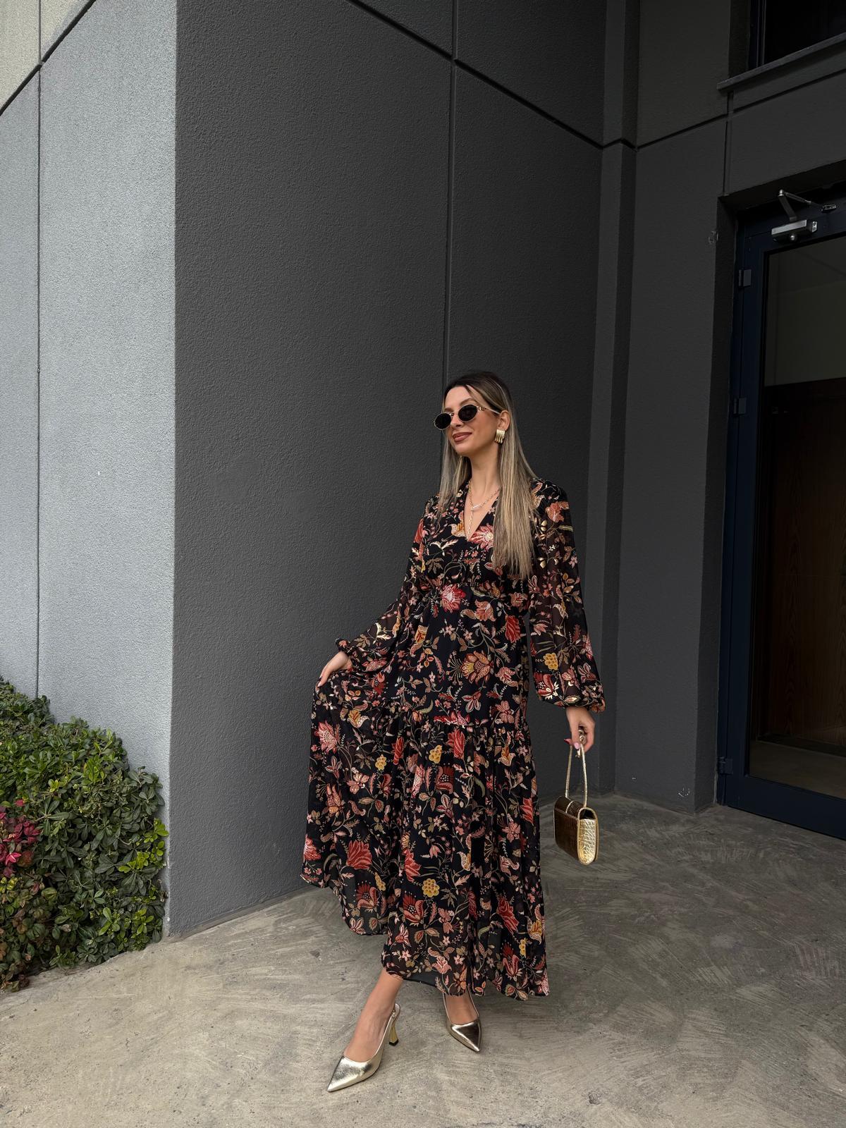 Orijinal Marka Gold Varak Baskılı Şifon Elbise Siyah (yelb2976hvn)