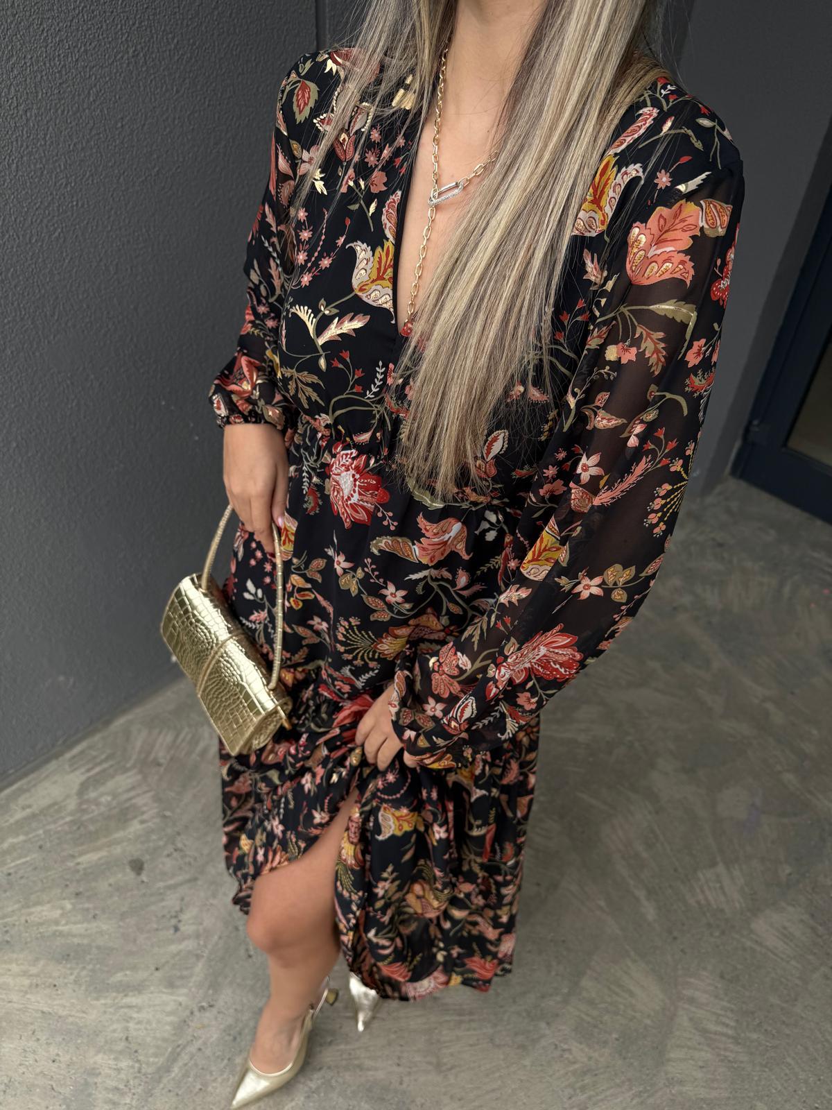 Orijinal Marka Gold Varak Baskılı Şifon Elbise Siyah
