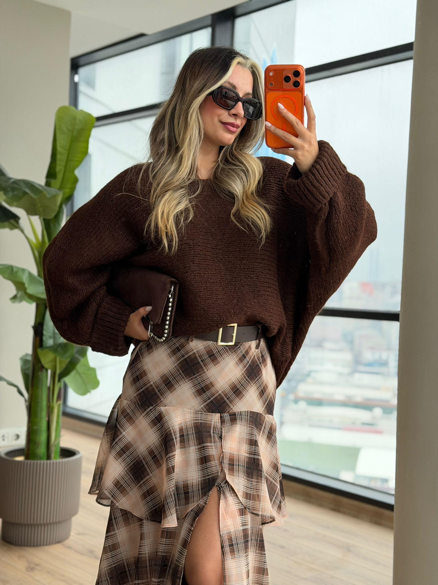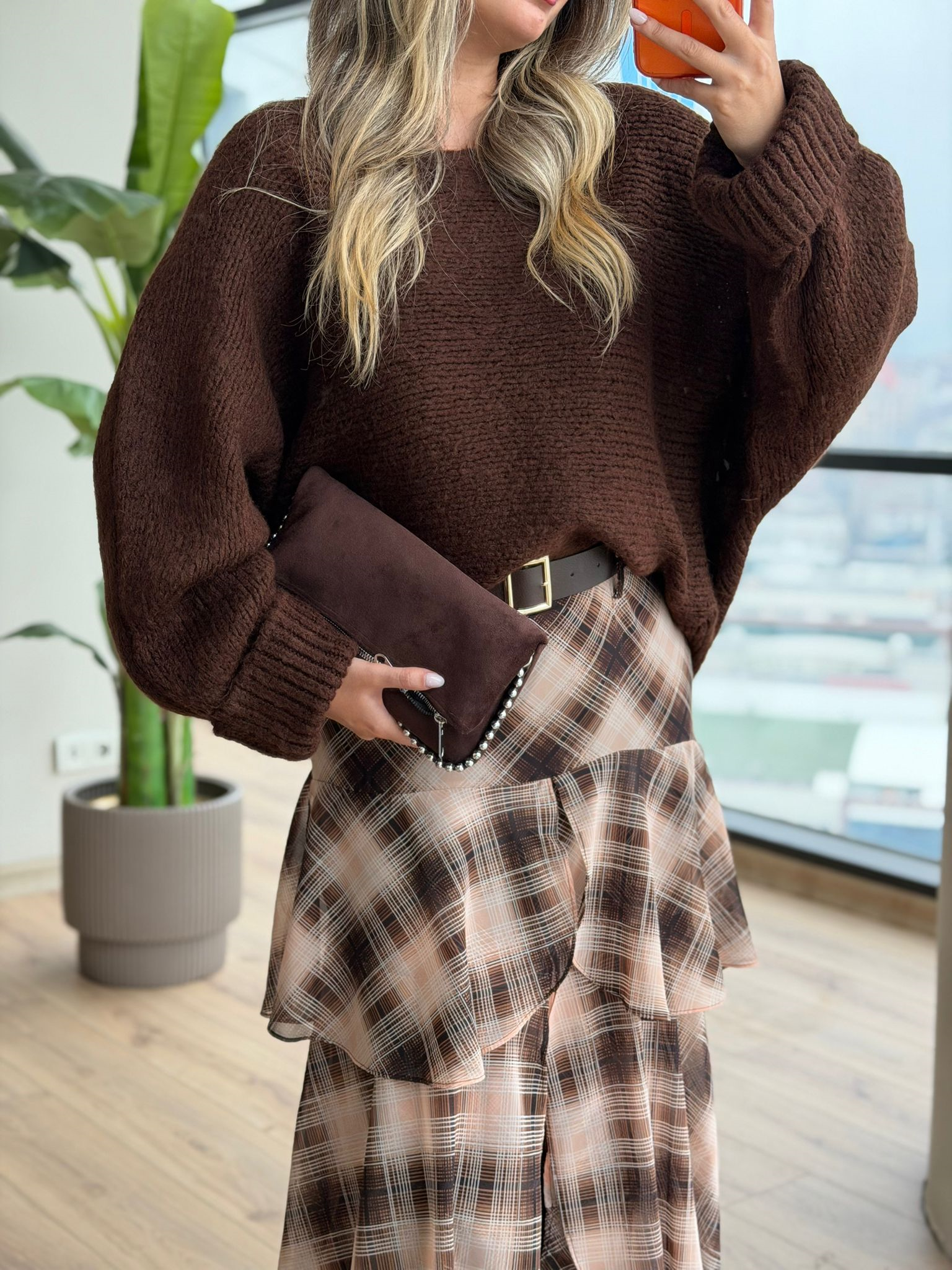 Bohem Kemerli Kat Kat Kahve Desenli Etek