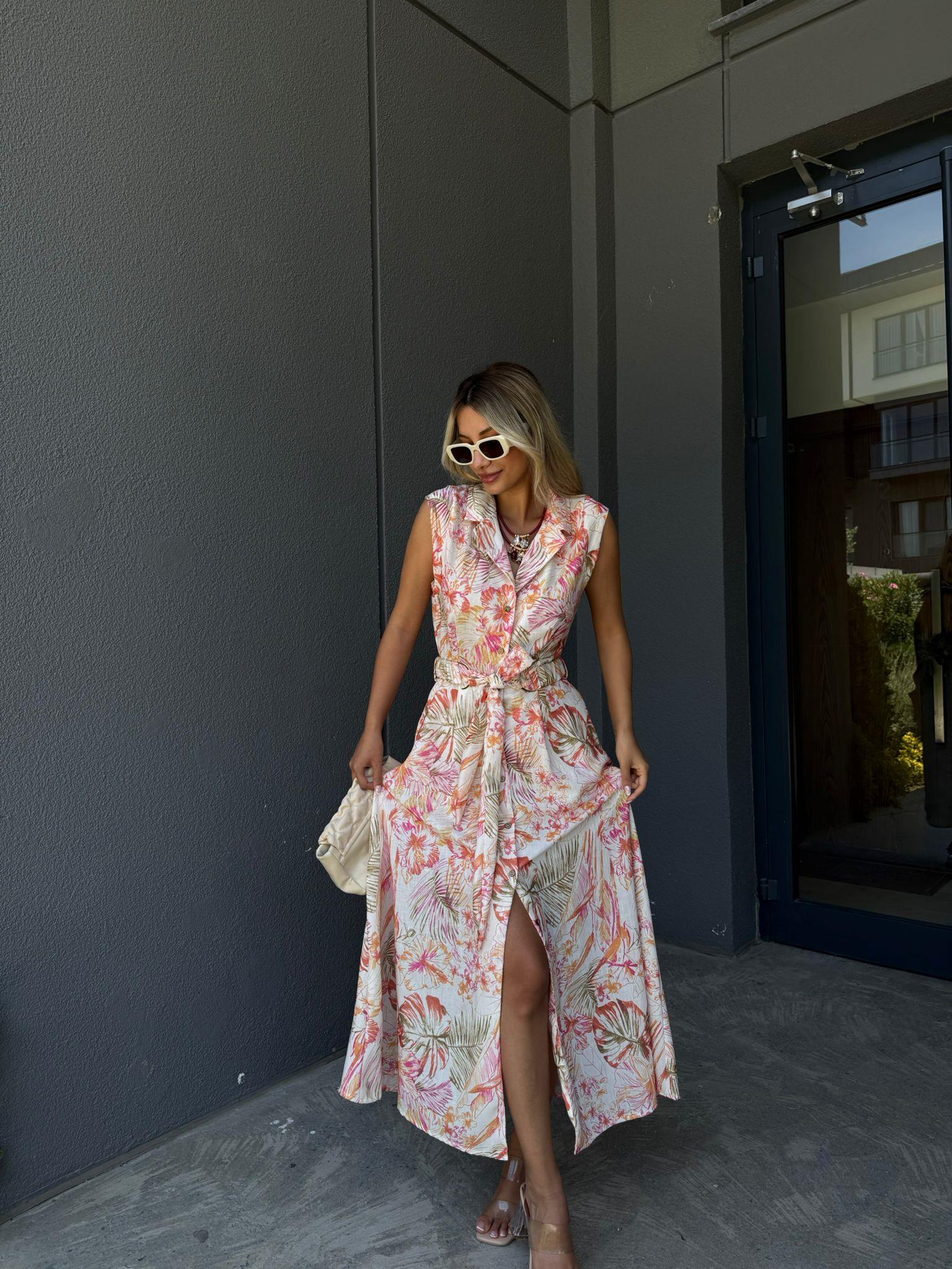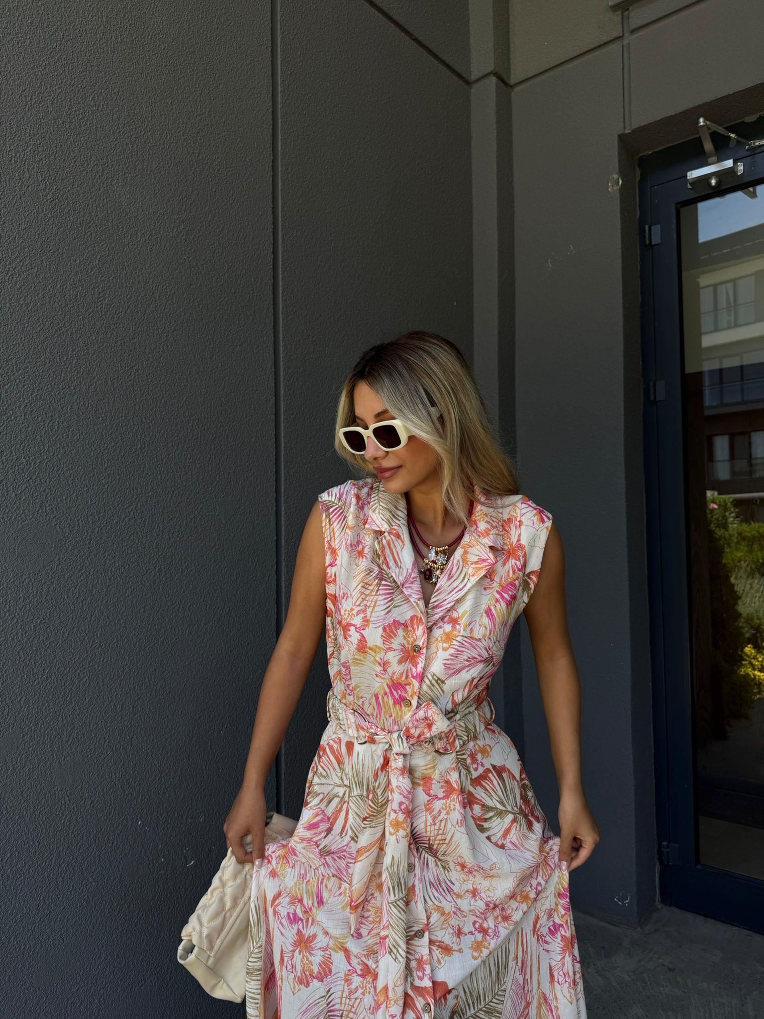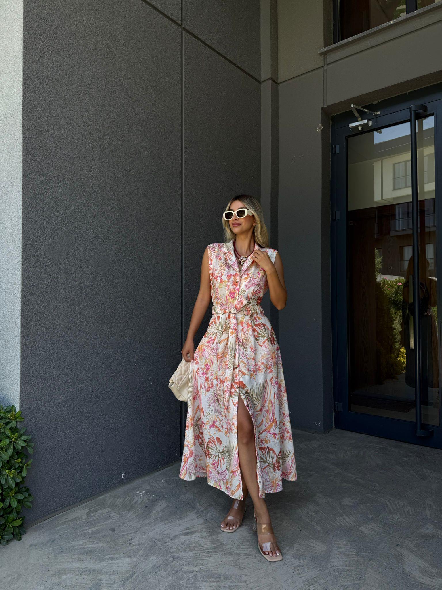 Pelina Desenli Kuşaklı Gömlek Elbise