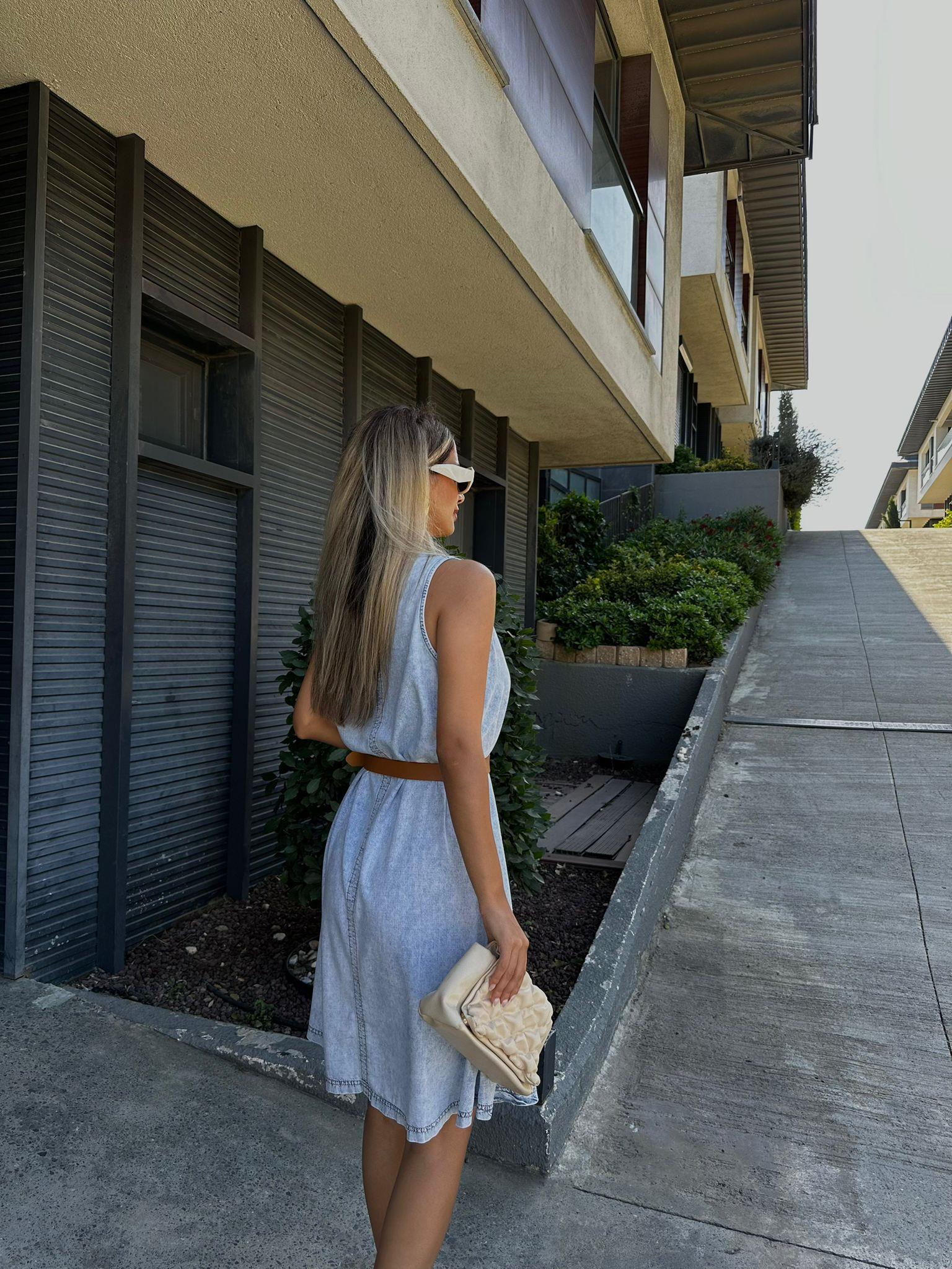 Sıfır Kol Kemerli Mavi Tensel Elbise
