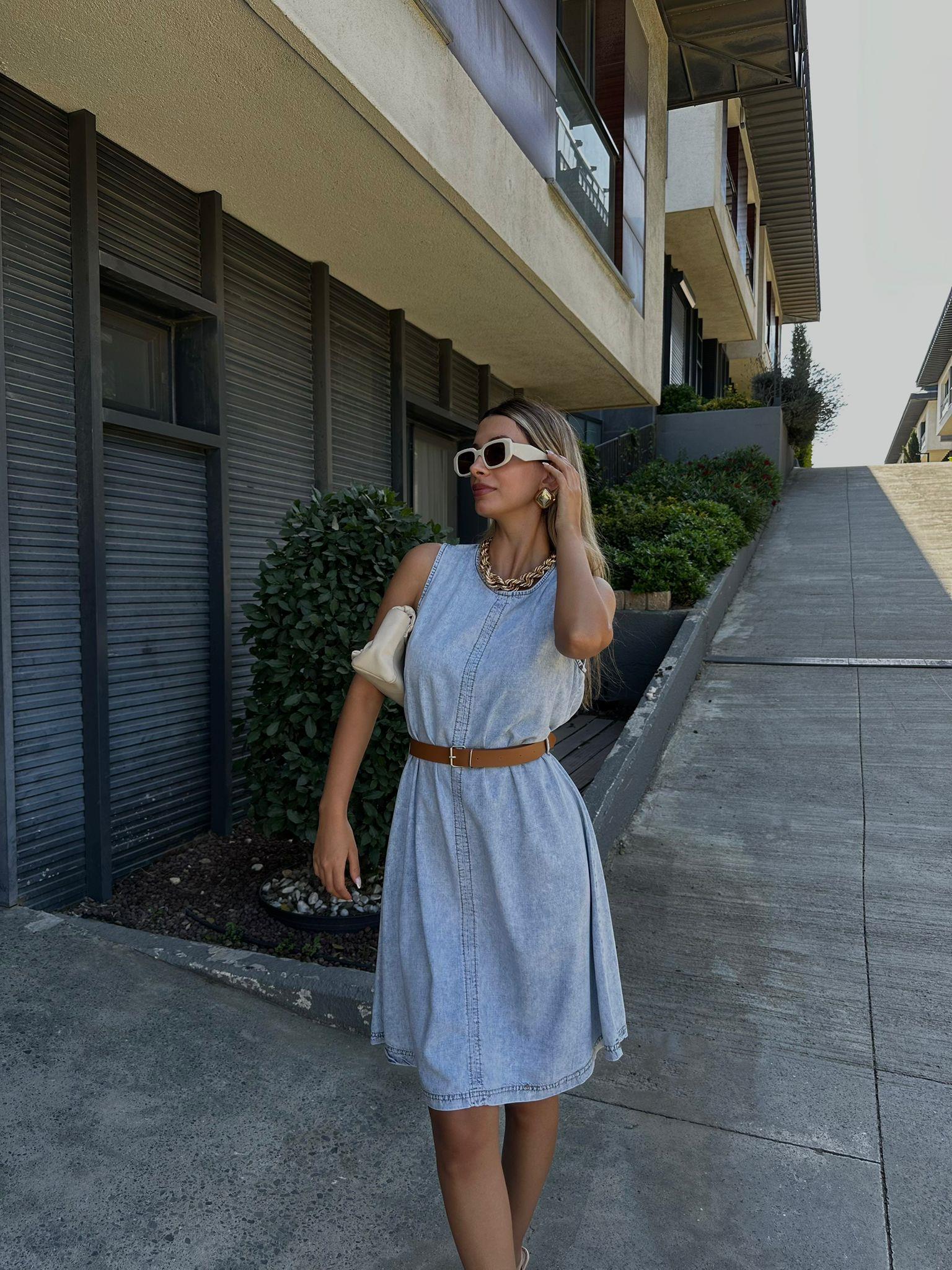 Sıfır Kol Kemerli Mavi Tensel Elbise (yelb2957rvd)