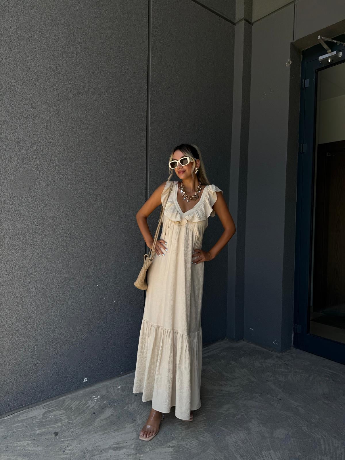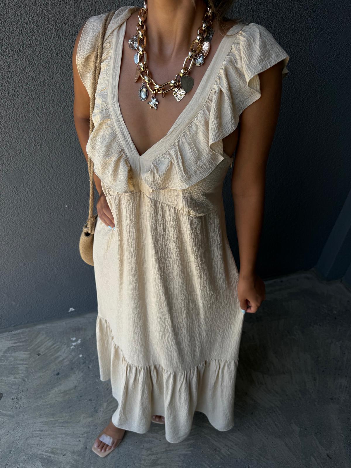 Sırt Gipeli Uzun Boy Omuz Fırfırlı Astarlı Elbise Taş (yelb2972ny)