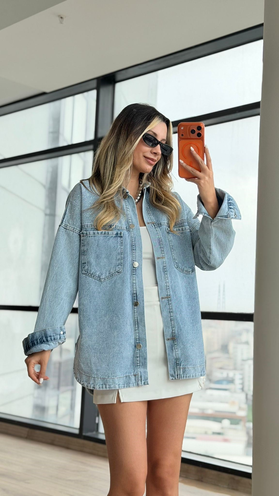 Sırtı Yıldız Taşlı Yıkamalı Mavi Oversize Denim Ceket (ckt4192yj)